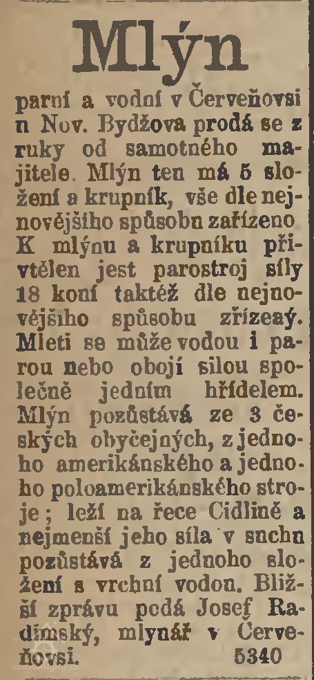 3 dny po sepsání závěti mlynář Čerych zemřel, vrchnost ale dala mlýn do veřejné dražny. Přihlásilo se 9 zájemců a mlýn odhadnutý na 5.625 zl. 15 kr. vydražil František Müller z Jičína za 9.455 zl.