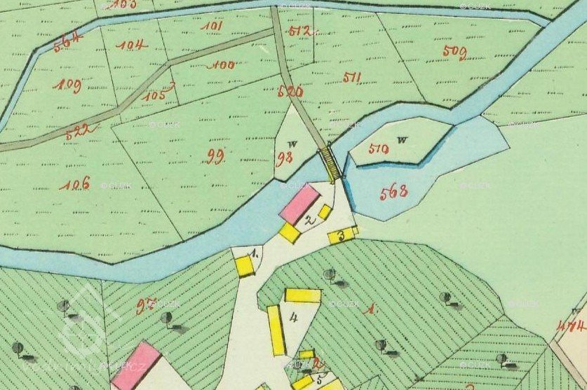 1700 Mlýn dřevěný, renovovaný 1698, podlahy špatné, střecha stará, došková, místy od větru poškozená. U mlýna hospodářské stavení, louka a haltýř.