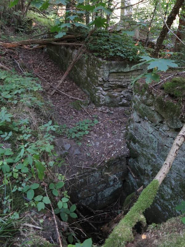 Vodní kolo bylo umístěno na severní štítové zdi a náhon je veden ze svahu za západní stěnou budovy. Voda byla do náhonu přiváděna pomocí vantroků (dřevěné koryto, které přivádělo tzv. svrchní vodu na mlýnské kolo). Z pozdějšího období je dochovaná i kamenná vana, ve které byla uložena vodní turbína.