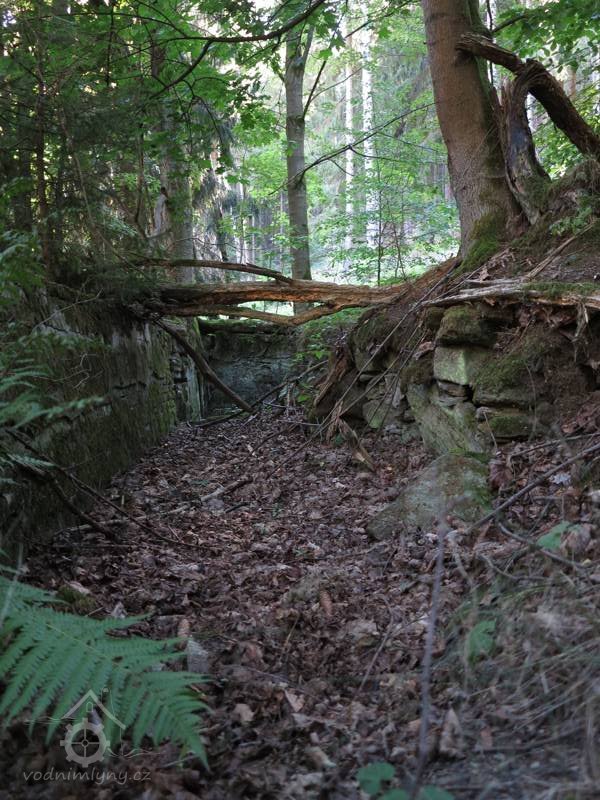 Náhon je veden ve svahu za západním průčelím, voda k mlýnu byla původně svedena vantroky. Mlýnské kolo bylo původně osazeno na bočním severním štítovém průčelí.