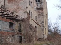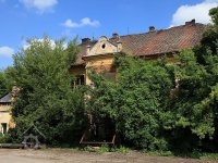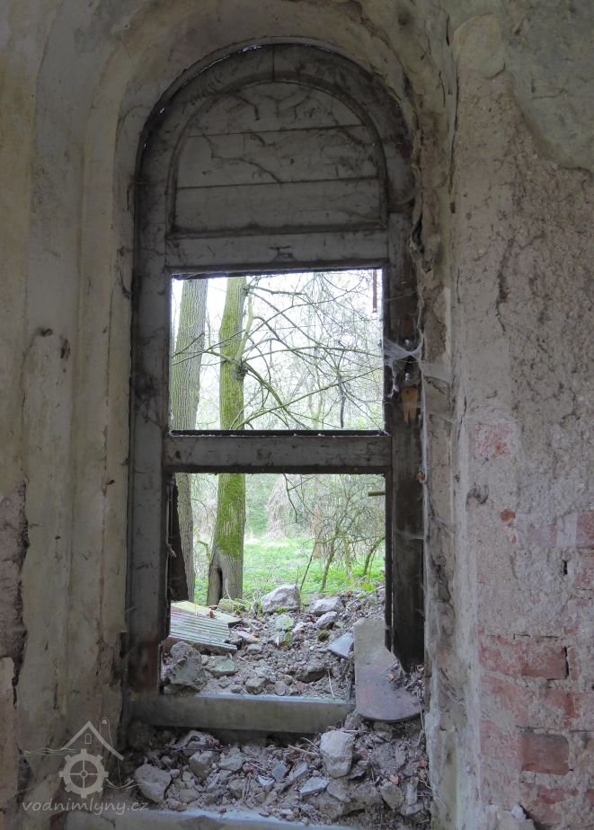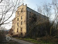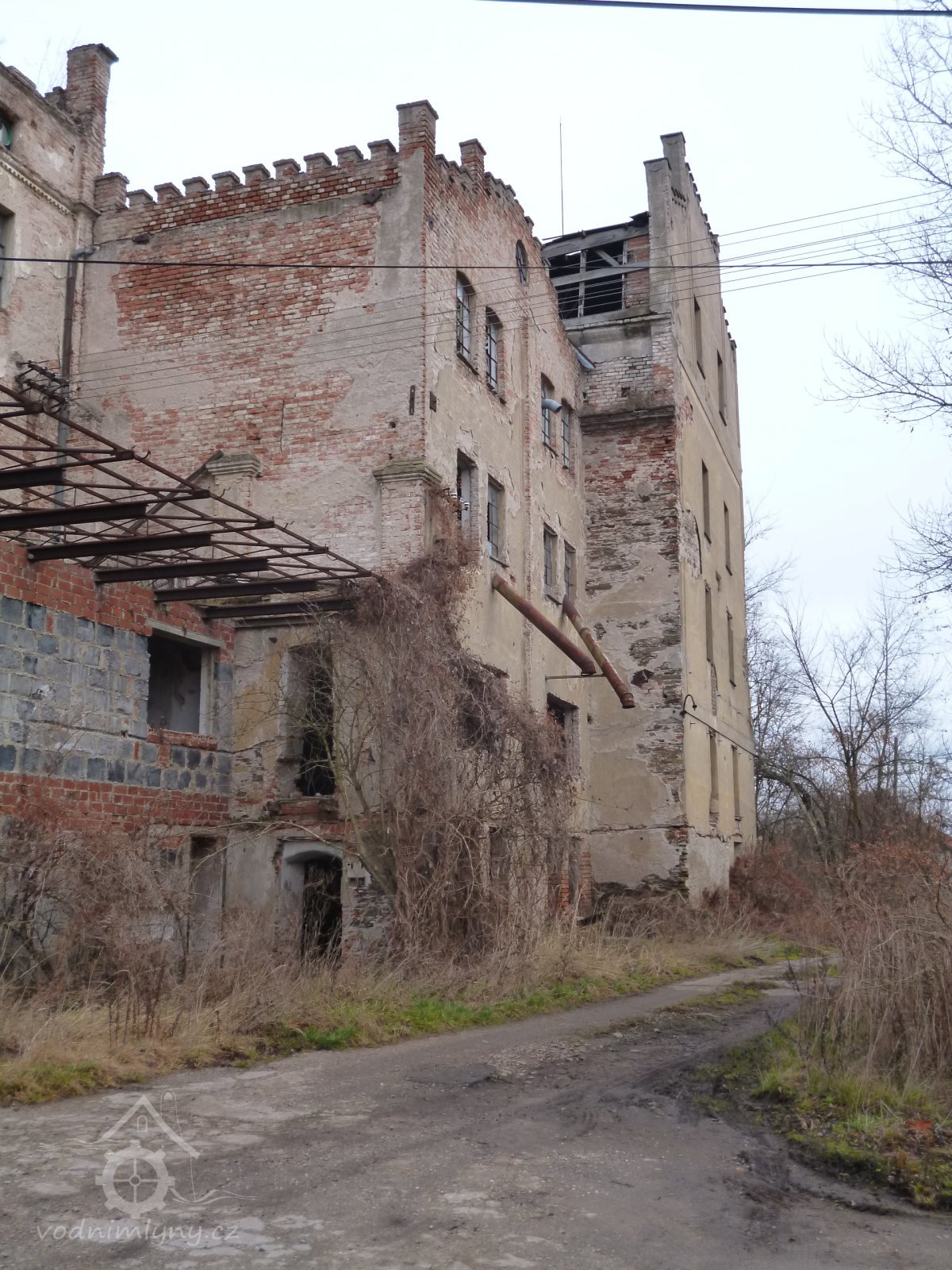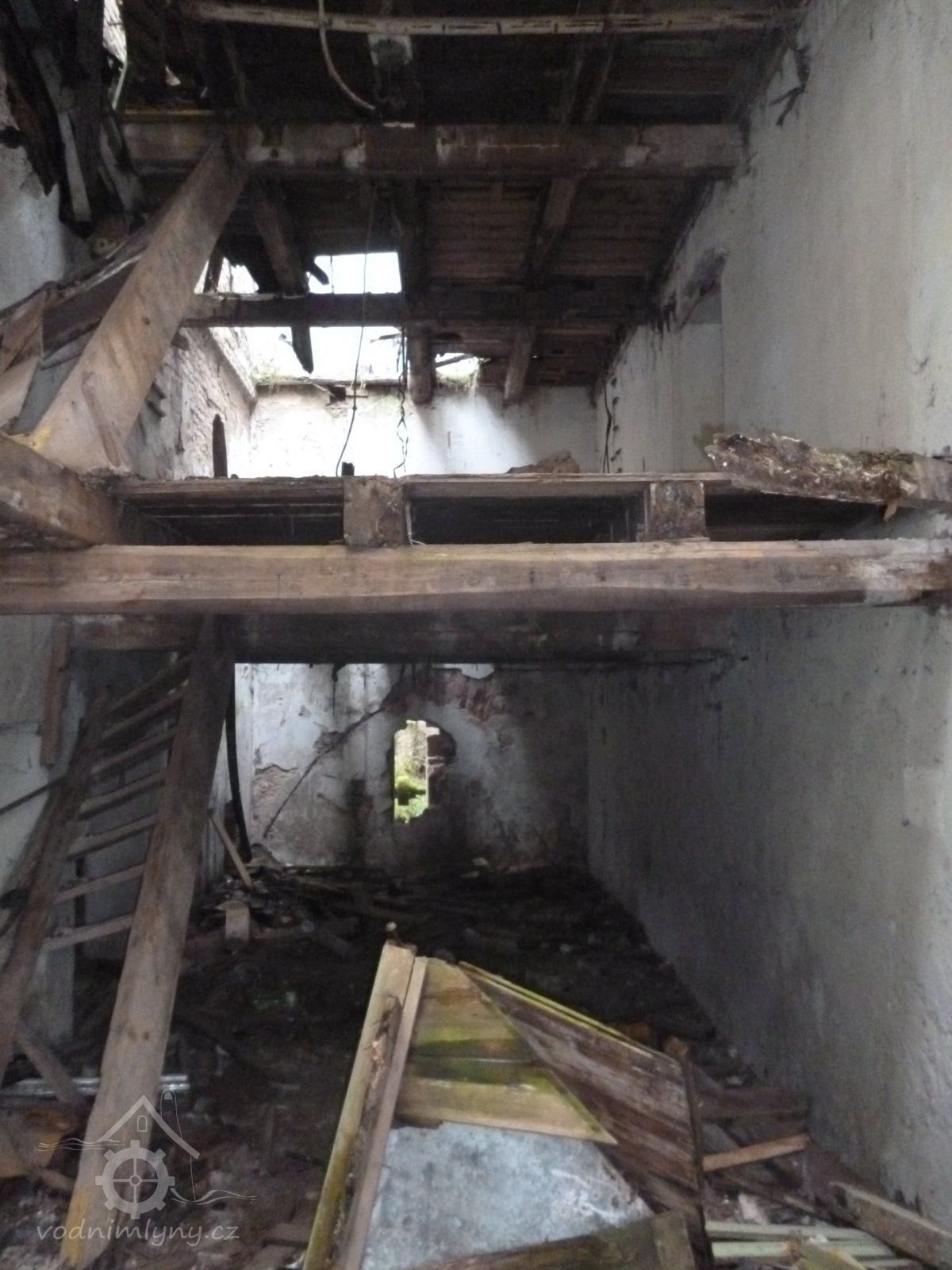 Se mlýnem spojená obytná budova - vila je v lepším stavu. Má střechu, schodiště, okna a dveře vylámaná (stav 04 2018)