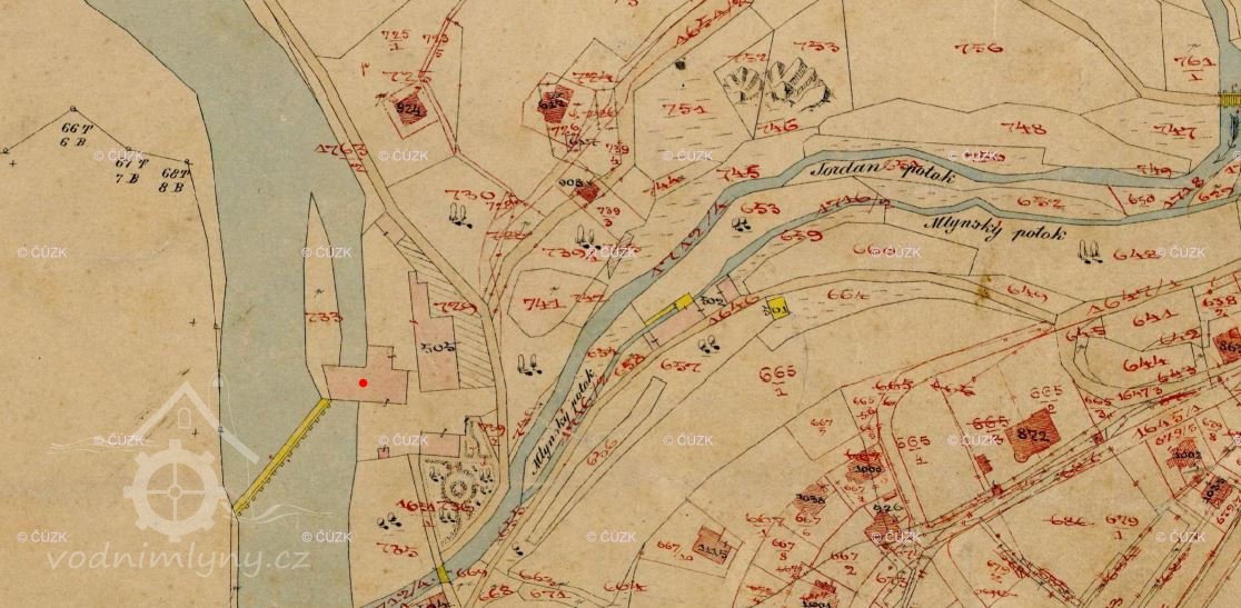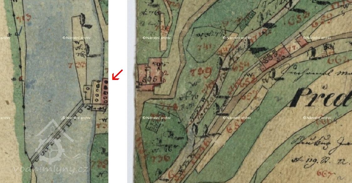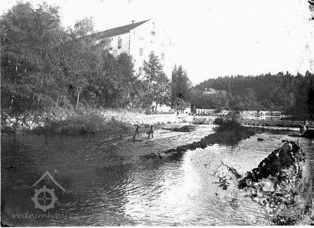 Popis1930: 2 kola na spodní vodu, hltnost 6,454 m3/s, spád 1,5 m, výkon 42,6 HP