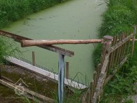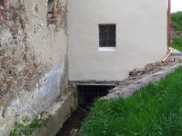 Odtokový kanál za turbínovým domkem až k objektu stodoly byl v roce 1990 zatrubněn, vtéká otvorem pod stodolu a za ní pokračuje opět kratším zatrubněným úsekem do přírodního toku potoka (edit PK)