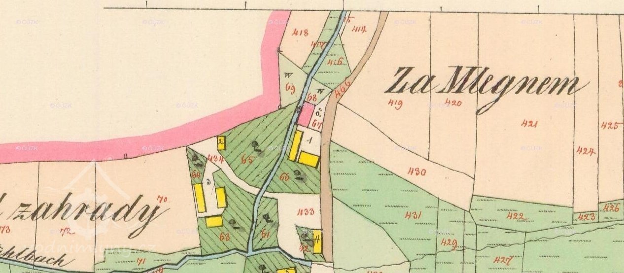 Mlýn byl napájen náhonem, který začínal až u Libáně. Potok, odtokový kanál (?) je zarostlý tak, že nelze zjistit více.