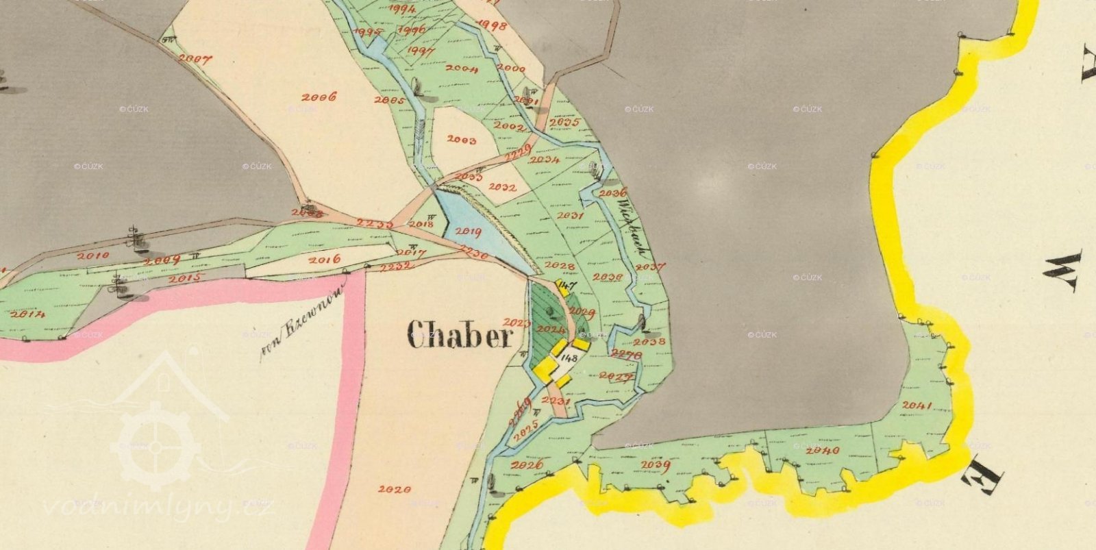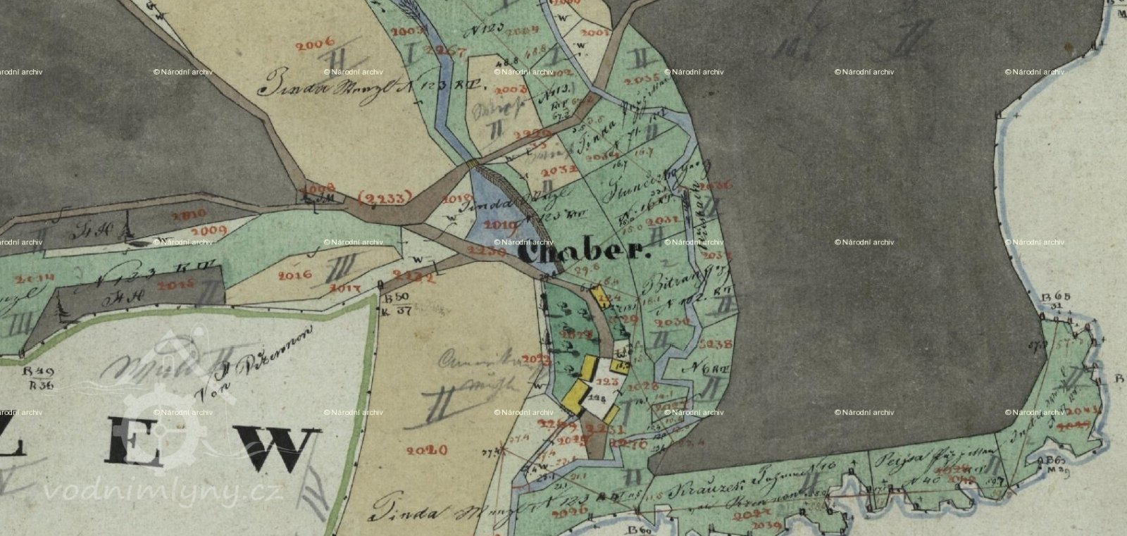 Chabrovský mlýn čp. 94/123, kontribučenský o 2 složeních a 4 stoupách se 4 jitry 309 sáhy polí, 2 jitry 725 sáhy luk 799 sáhy zahrady a pastviště v ceně 5.215 zl. 15 kr.
