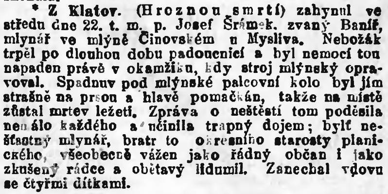 1866 Josef Šrámek zv. Baníř při epileptickém záchvatu zachycen a rozdrcen palcovým kolem