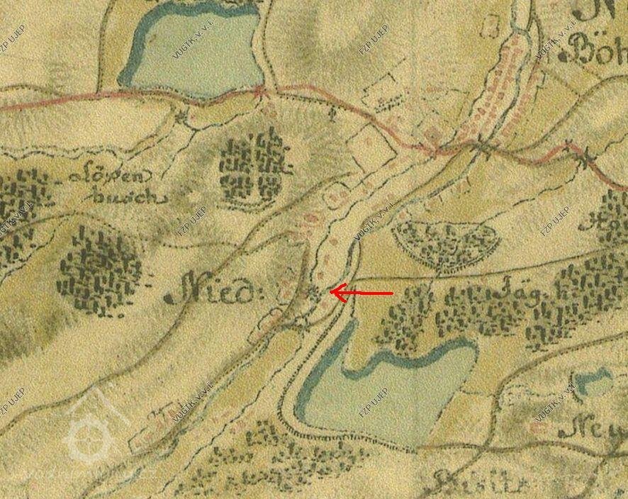 Na Indikační skice z roku 1842 je mlýn již zbarven červeně, byl již zděný. Měl čtvercový půdorys, skládal se z mlýnice, obytné budovy a dalších hospodářských budov. V té době měl tři složení a pilu. Číslo popisné měl 89, postaven byl na stavebním pozemku číslo 93.