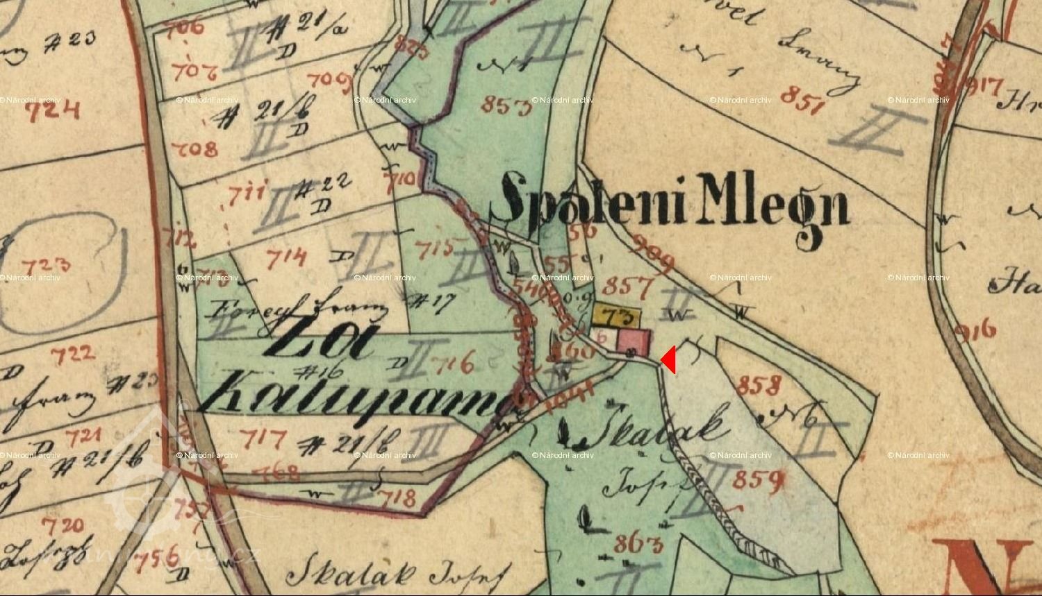 ...“Sotva 0,5 km na sever (myšleno od Heranova mlýna-poznámka přispěvatele) je osamělé stavení, kterému se říká „Spálený mlýn“. Náhon vroubený olšemi připomíná, že tu skutečně mlýn býval; patřil Spálenkovi. Když asi před 30 lety vyhořel, vystavěli na spáleništi domek, ale mlýnu už nezřídili. Patří Anně Jelínkové z Dolních Nových Dvorů. Má tu nájemníka…“