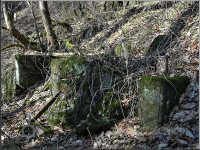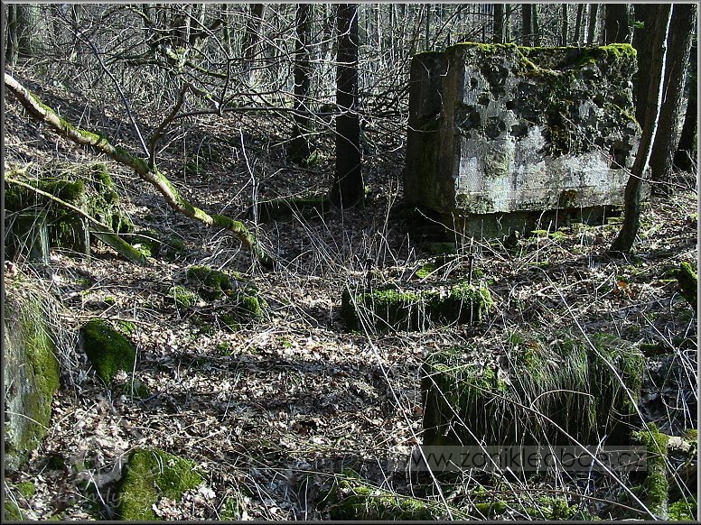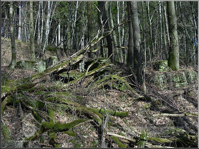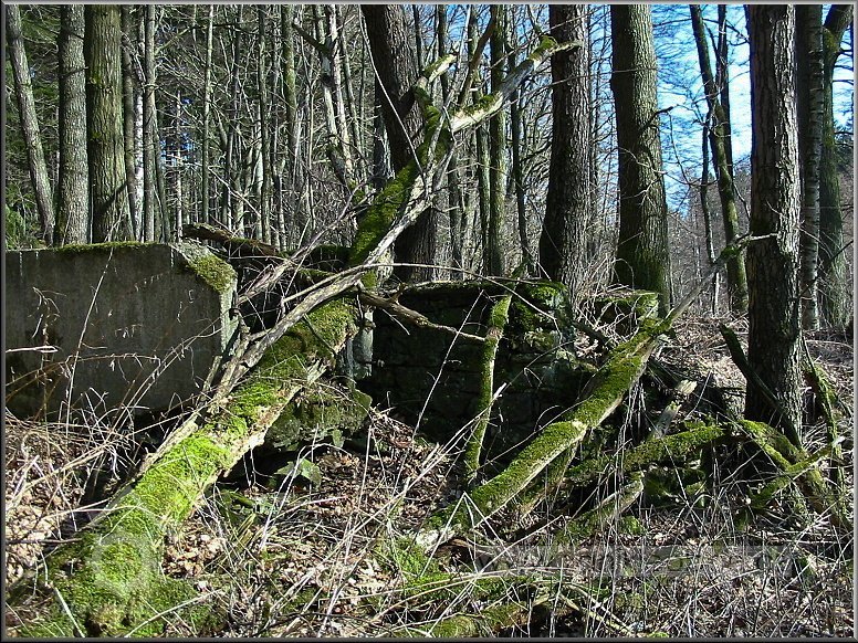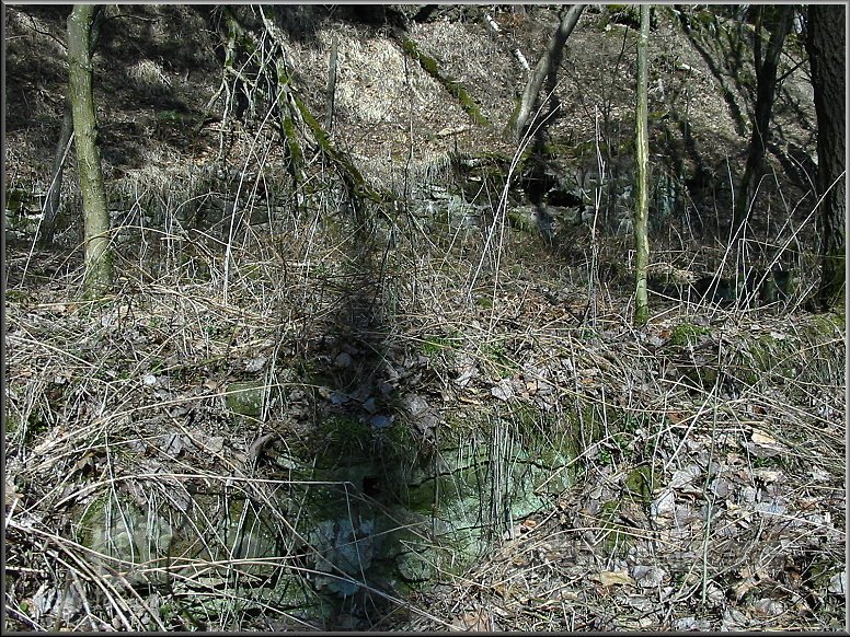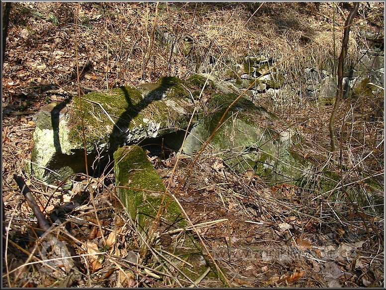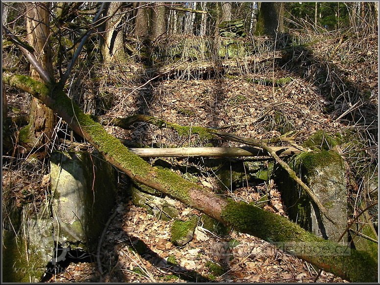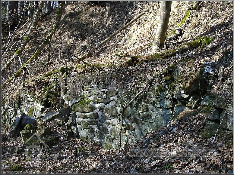 Další pozůstatky po vedlejší mlýnské budově, v pozadí stará cesta od Srubů k Liščí, nad níž se nacházejí základy hlavní mlýnské budovy, 03 2012, © Petr Bílek