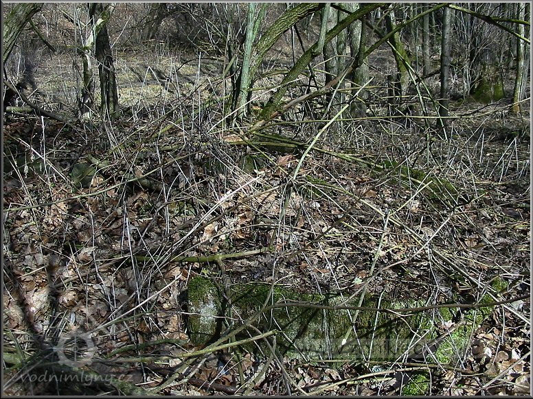 V pozadí patrný náhon, kterým se přiváděla voda do betonového koryta a dále na mlýnici, 03 2012, © Petr Bílek, (Prvky na obrázku: vantroky)