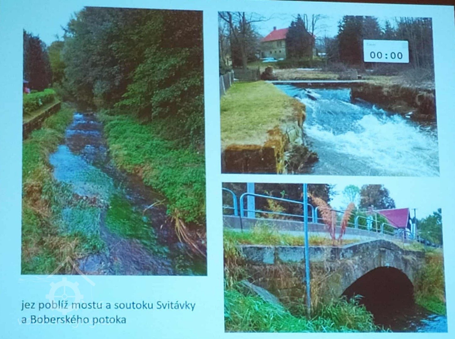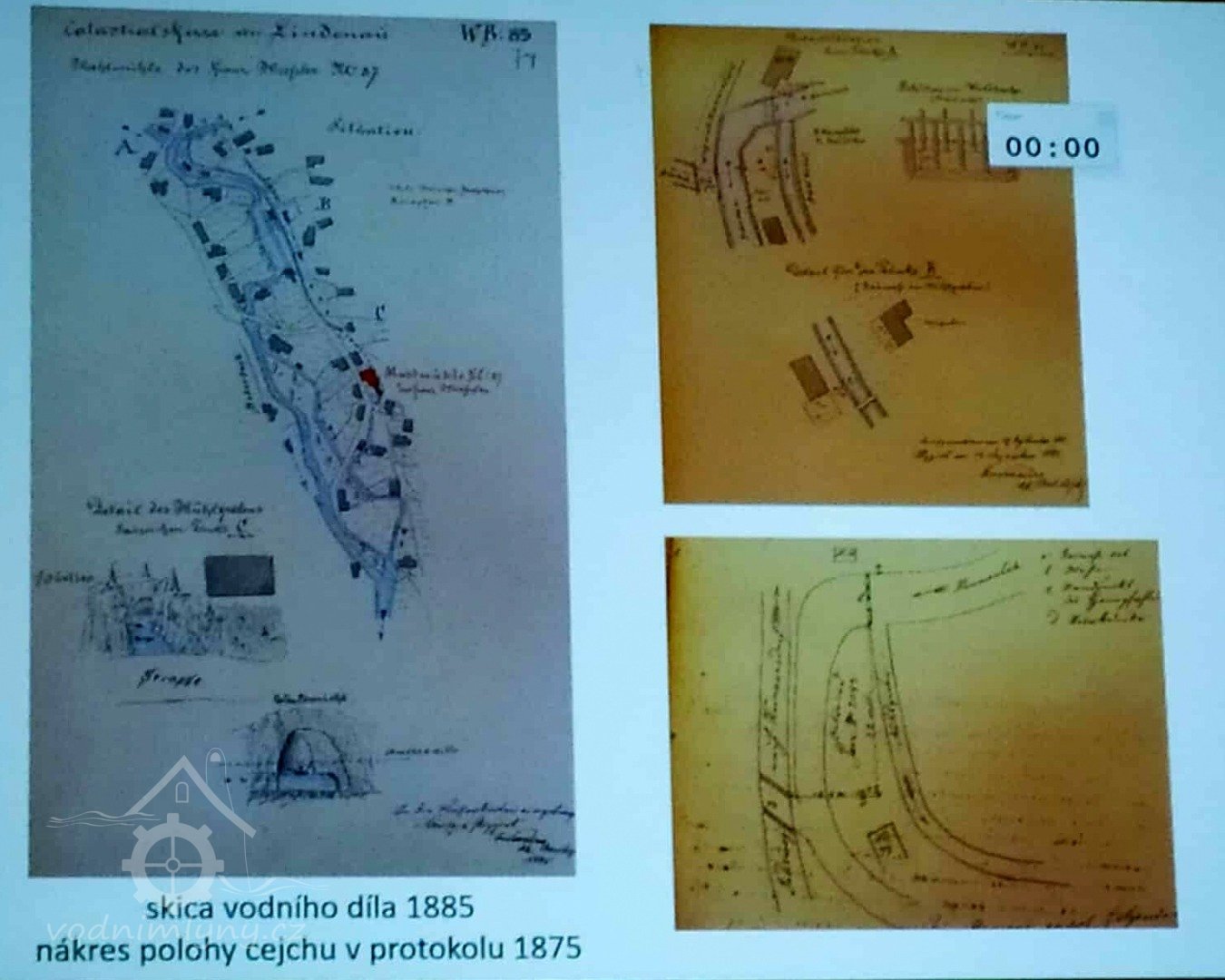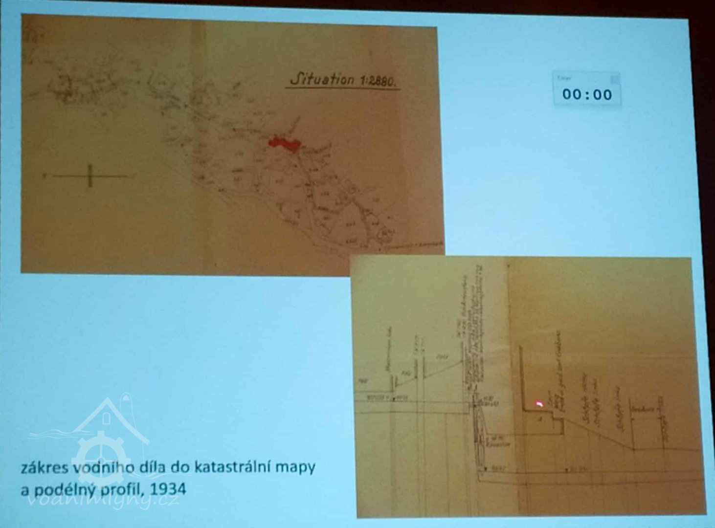 · revize vodního díla 1934/35 - Franz Lorenz (zaprotokolování jeho firmy je uváděno k r. 1903), náhon měl délku 349 m, šířka 1,75 m, hloubka 1 m, u jezu dvojité stavidlo (3,34 x 0,57 m), vpouštěcí stavidlo do náhonu (2,5 x 0,83 m), odpadový kanál o délce 270 m (profil 2,2 x 1 m), cejch u jezu, vzdouvací značka 36 m před mlýnem vlevo na skále, služebnost - odebírání vody z náhonu a mosty přes náhon, vantroky 1,96 x 0,53 m (stavidlo 1,87 x 0,39 m), náhradní síla není,