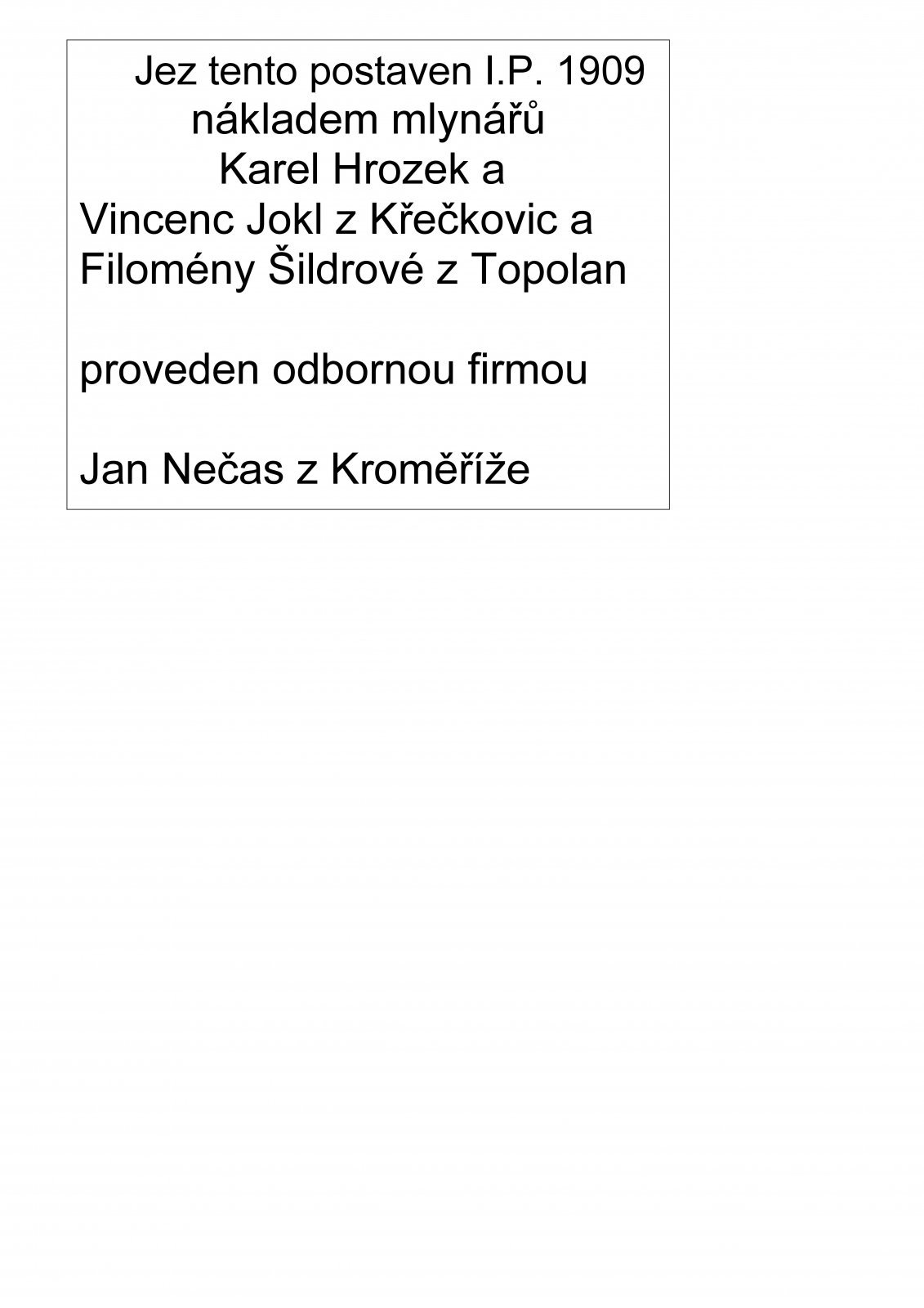 Popis1930: 1 kolo na svrchní vodu, hltnost 0,24 m3/s, spád 2,8 m, výkon 7,26 HP