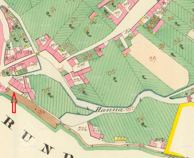 Mlýnská hranice stála u návodní zdi, obtékané vodou Rostěnky a Drnovky.