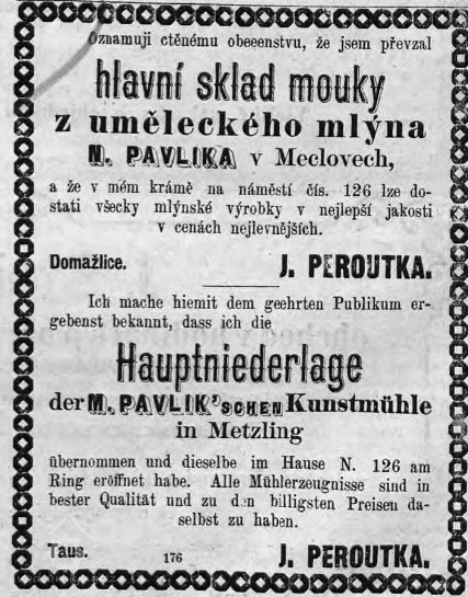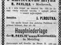 1921 - Jediné dochované sčítání obyvatel v roce 1921 uvádí jako majitele objektu M. Pavlíka, mlynářem je Josef Peter *1869 v Mirkovicích německé národnosti.