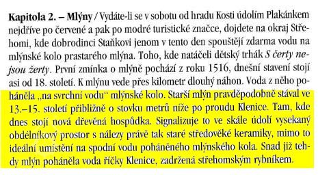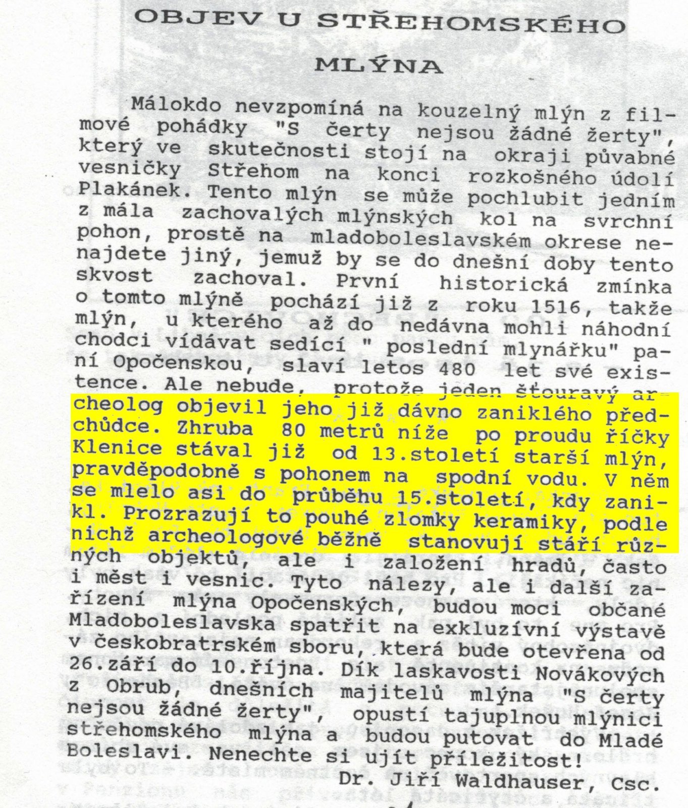 Mlýn stál a fungoval od 13. do 15. století - datace na základě zde nalezené keramiky. Později začal fungovat výše situovaný mlýn - roubený, Střehomský.