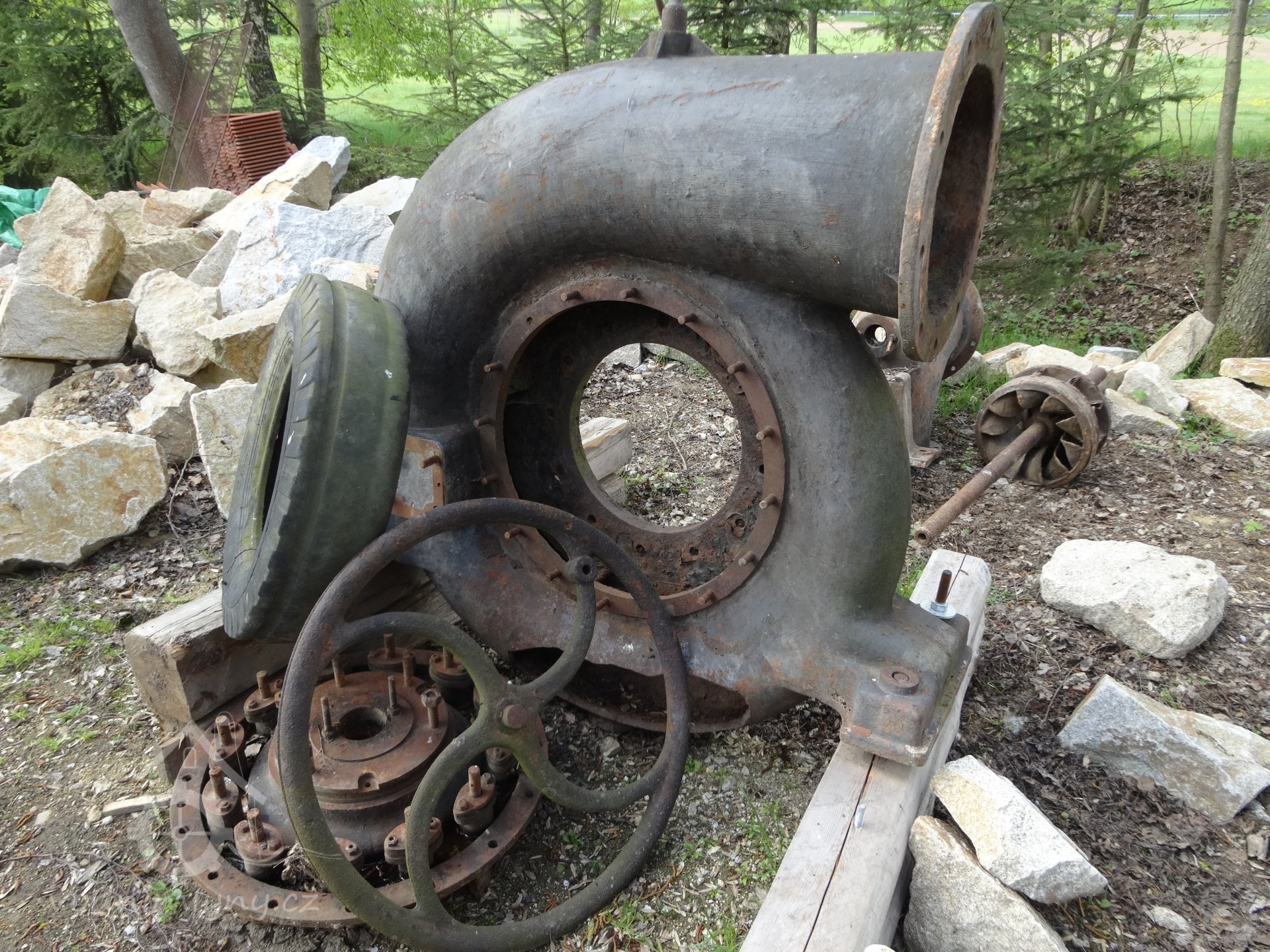 Zbytky Francisovy turbína, která byla instalována v r.1910 a mlecí kámen s letopočtem 1935