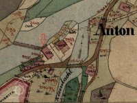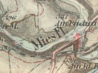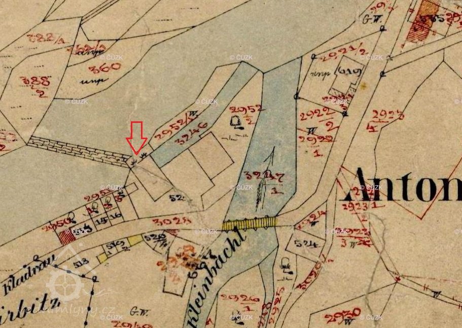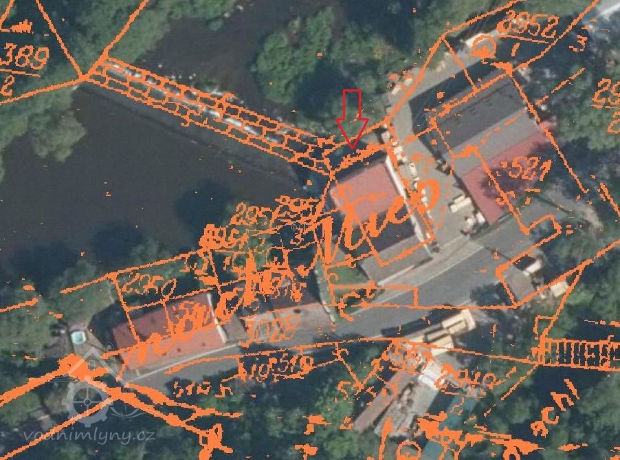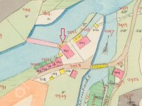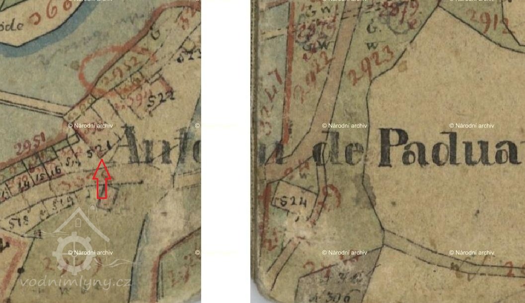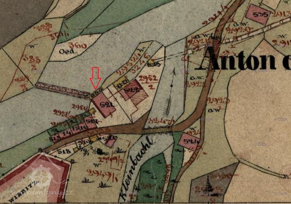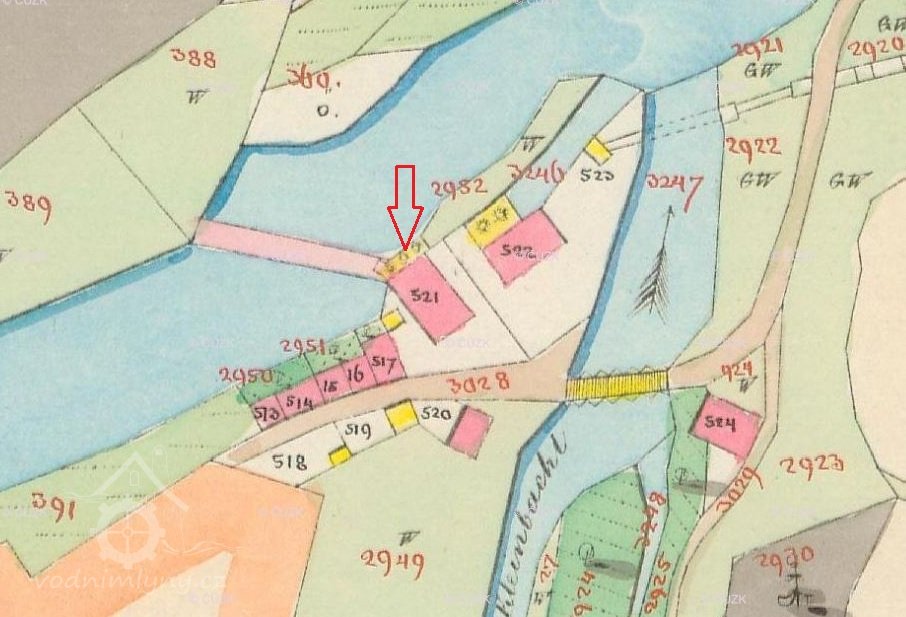 Na mapách stabilního katastru je mlýn vyobrazen na parcele č. 521 se 3 vodními koly. Vedle něj stojí na parcele č. 522 další objekt se 2 vodními koly.