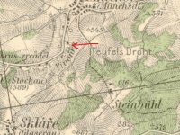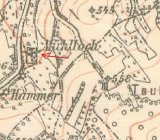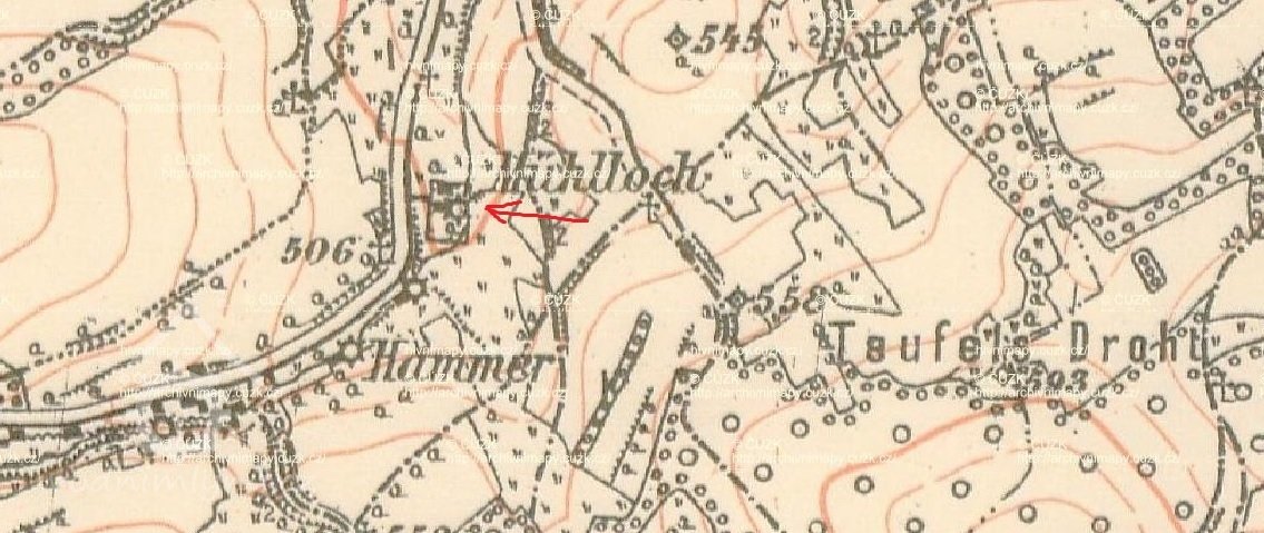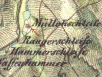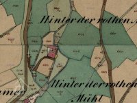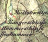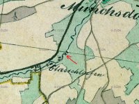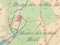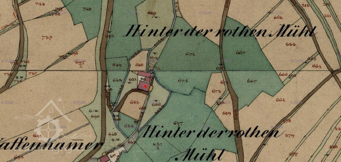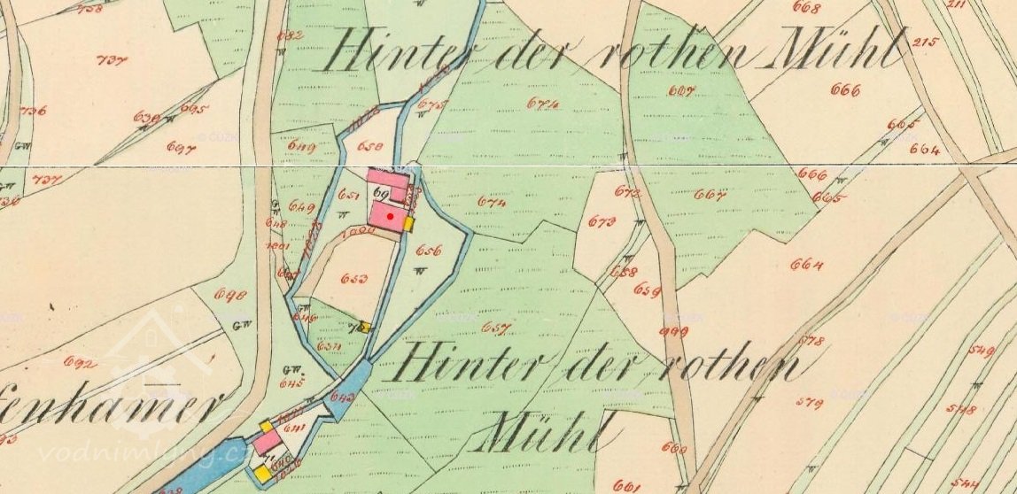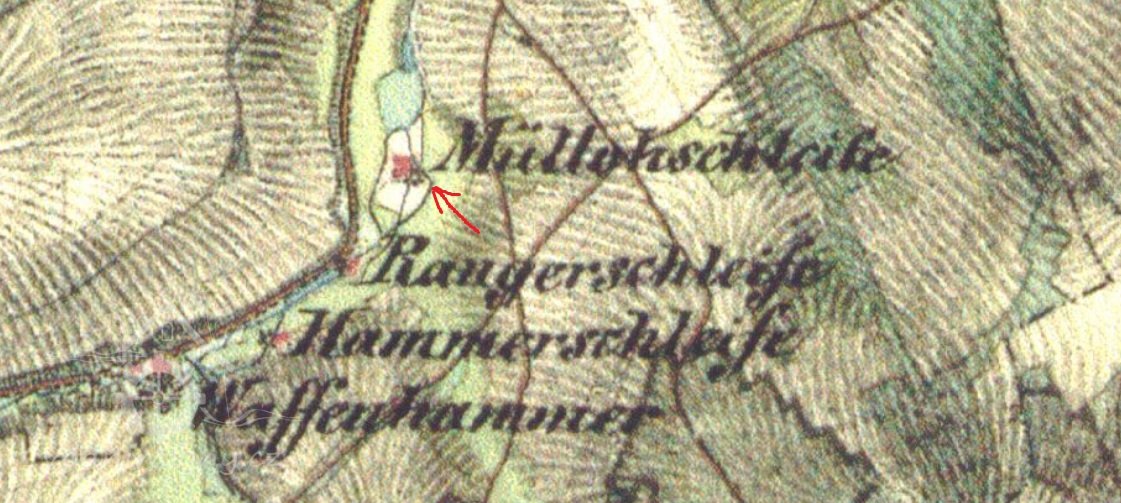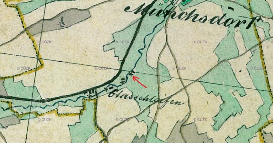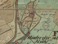 1838 – na skice, otisku i originální mapě stabilního katastru nespalná obdélníková budova s dřevěným přístavkem na náhonu, druhá budova ve tvaru L. Vodní kolo není zakresleno. V majetku sklářského rodu Zieglerů.