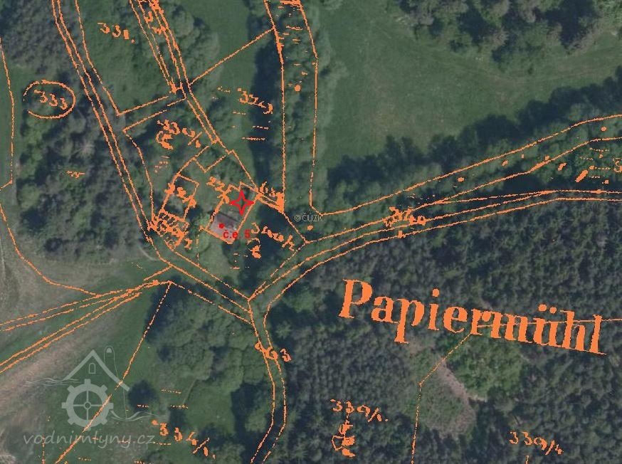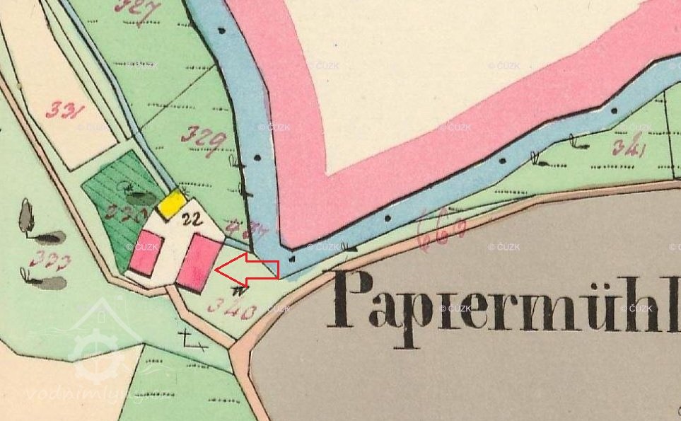 Popis1930 – 1 vodní kolo na vrchní vodu, průměr 3 m, šíře 1 m, hltnost 0,17 m3/s, spád 3,2 m, výkon 4,74 HP