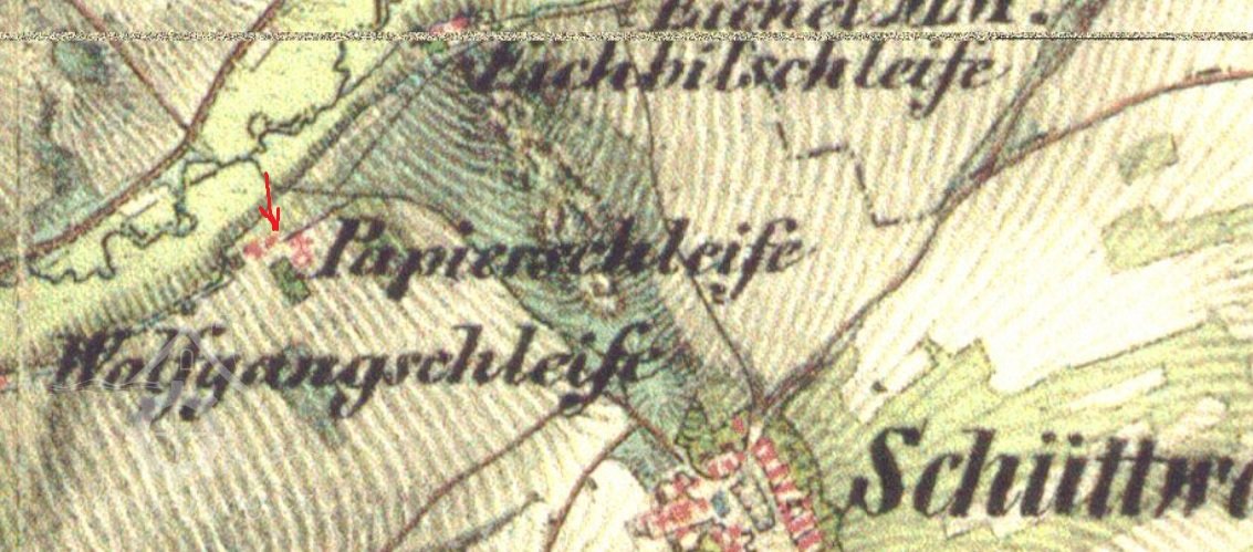 Původně velice starý a zajímavý provoz. V historických pramenech je nazýván Horní šitbořskou leštírnou, Papierschleife nebo Schlösschen – Zámeček. Již v 17. století stávala v těchto místech papírna pivoňského kláštera, jejíž pustnoucí stavbu obnovil v roce 1746 pivoňský převor Cyriak Wotava. Provoz je zobrazen na I. vojenském mapování – josefském (1764-1768 a 1780-1783). V roce 1824 vyměnil zdejší papírník Josef Bock (Beck) starou papírnu s Janem Wolfgangem Zieglerem za papírnu na východním okraji Poběžovic. V letech 1835 – 1836 zde Wolfgang dal upravit starou papírnu na brusírnu a vystavět obytnou budovu, nazývanou Schlösschen. O budově tzv. Zámečku, postaveného v těsné blízkosti leštírny, kolovaly pověsti o tom, že tu prý straší.