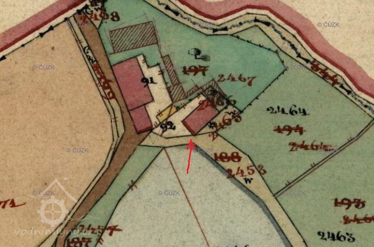 1838 – Indikační skica a otisk stabilního katastru zaznamenává nespalnou budovu obdélníkového tvaru s jedním kolem, rybník a náhon, majitelem Václav Hakl. Následně mlýn převzal syn Václav s manželkou Johannou rozenou Kocourovou z Močerad.