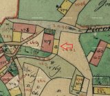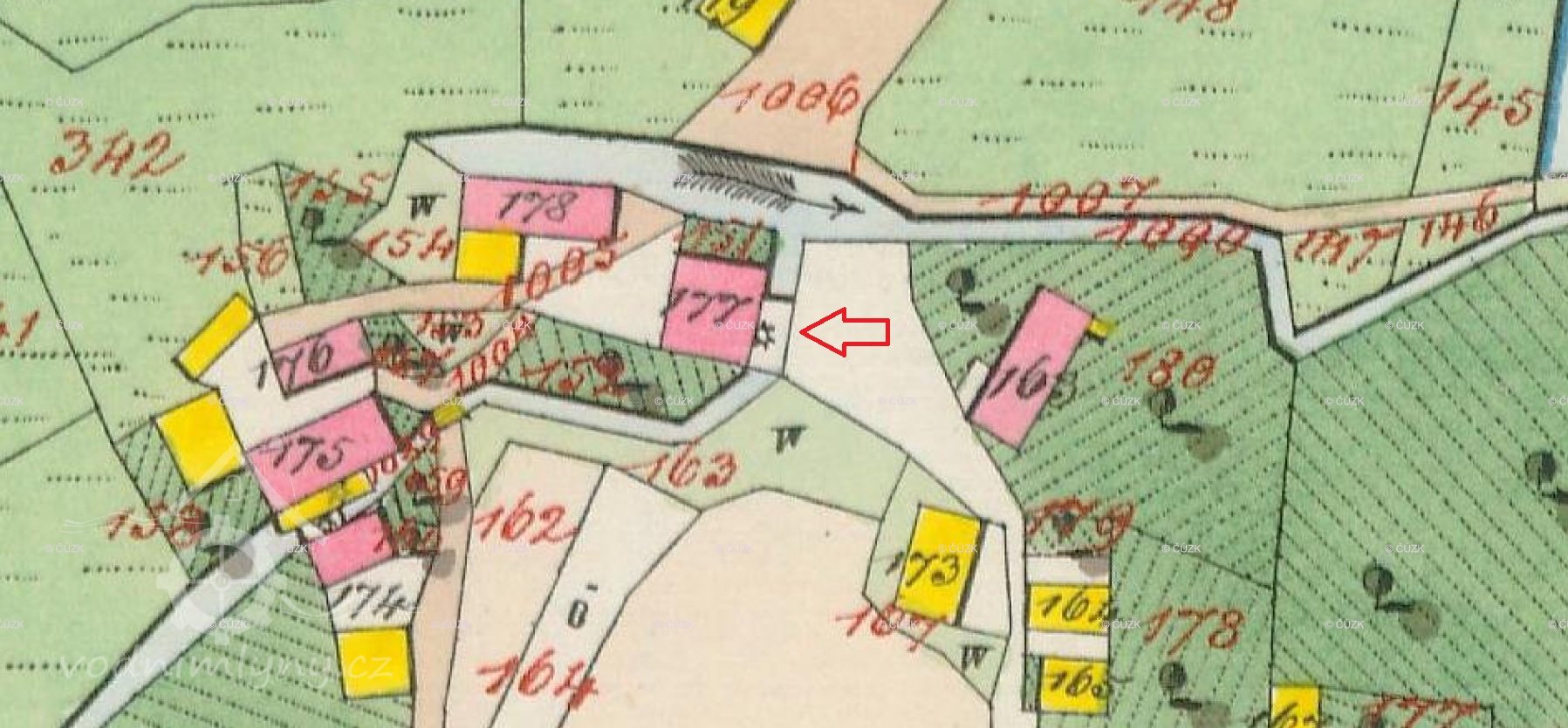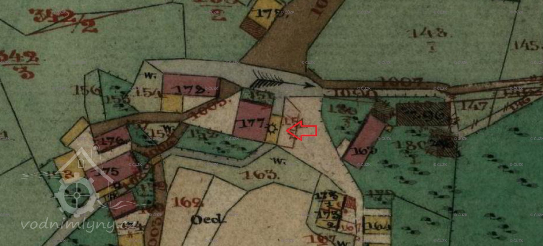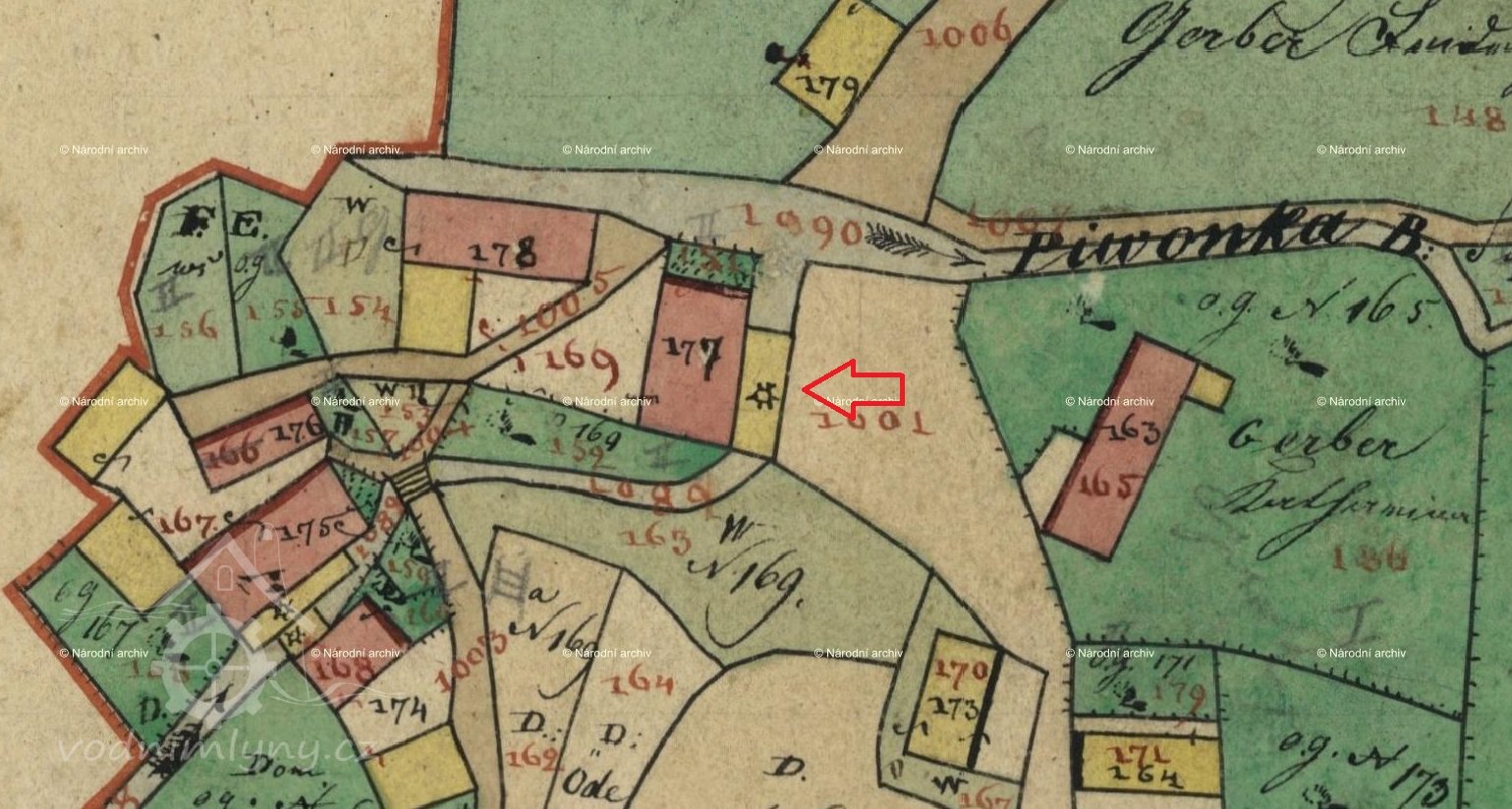 Indikační skica, originální mapa i otisk stabilního katastru v roce 1838 – obdélníková zděná budova s přístavbou nebo krytem lednice ze dřeva s jedním kolem, Pivoňka přitéká shora od dalšího mlýna . Vlastníkem je Mauka.