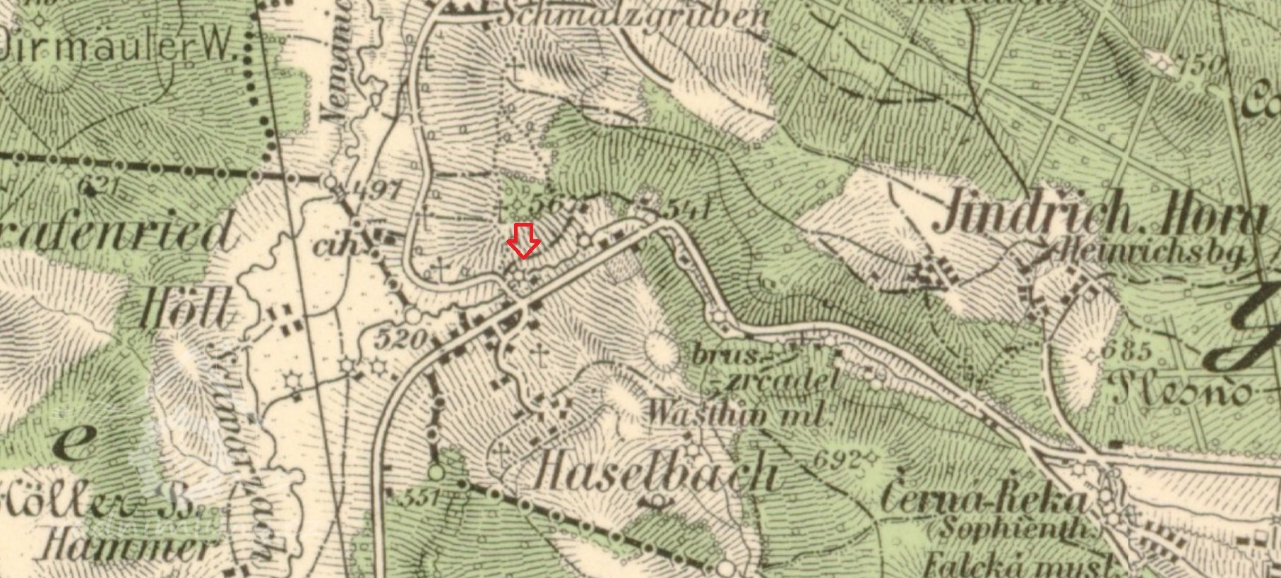PopisSeznam a mapa vodních děl Republiky československé z roku 1930: Černý potok – Haselbach 34 – H. Oesterreicher – brusírna skla – 1 kolo na svrchní vodu – 0,145-5,54-7.