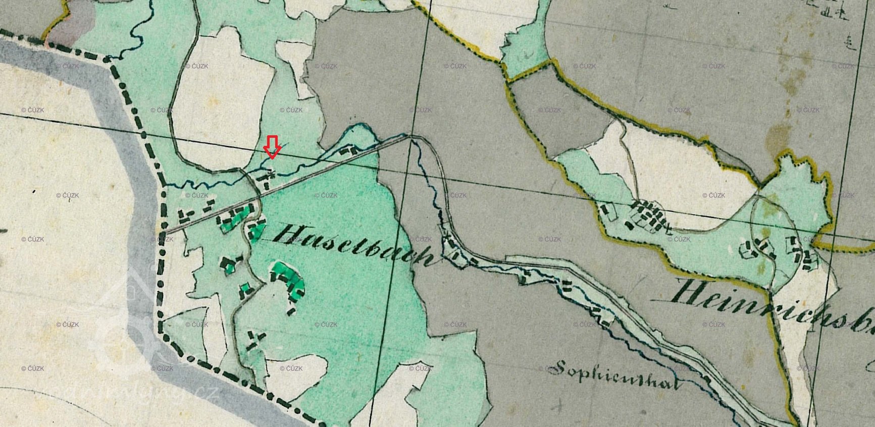 1838 – skica stabilního katastru – č. 34 je obdélníková nespalná budova s jedním kolem a dvě spalné budovy, již zaznamenané rozsáhlé stavební úpravy, které potvrzuje originální mapa. Pravděpodobně v tomto období došlo k přestavbě na šlejf.