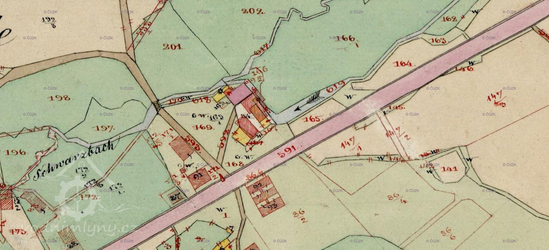 Soustava Zieglerovských zušlechťovacích podniků na Černém potoce patřila k nejrozsáhlejším průmyslovým podnikům v kraji. Pracovalo zde až 20 samostatných provozoven: brusírny a leštírny skla, fazetárny, stoupy, výroba cínových fólií k výrobě zrcadel, pokládárna zrcadel apod. Budovy byly přestavovány a využívány k právě potřebnému účelu. Těsně pod silnicí do Nemanic stával šlejf Mühlau č.p 46 (staré č. 34) přestavěný ze starého mlýna, existujícího již v roce 1838.