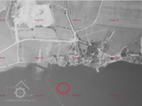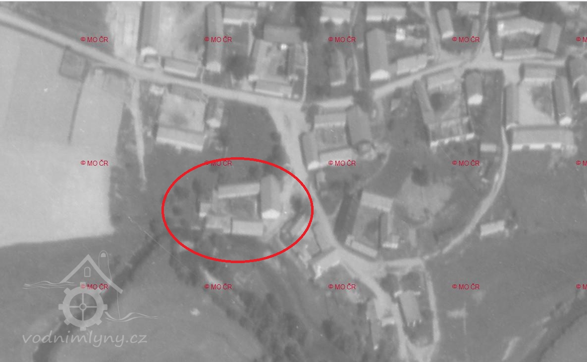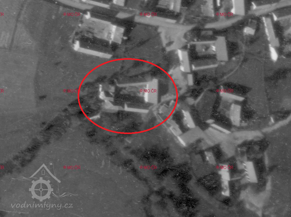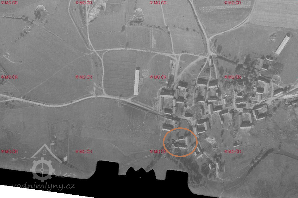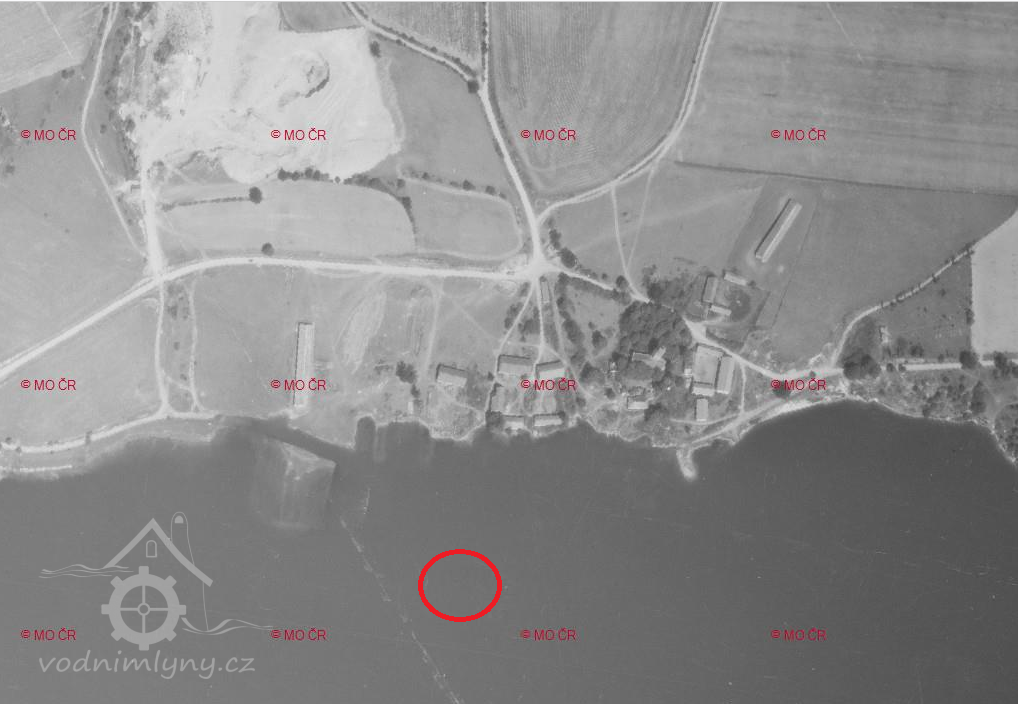 Letecký měřičský snímek, mlýn už zmizel pod hladinou. Na snímku je vyznačeno přibližné místo, kde stál., 1964, © Archiv - Zeměměřičský úřad
