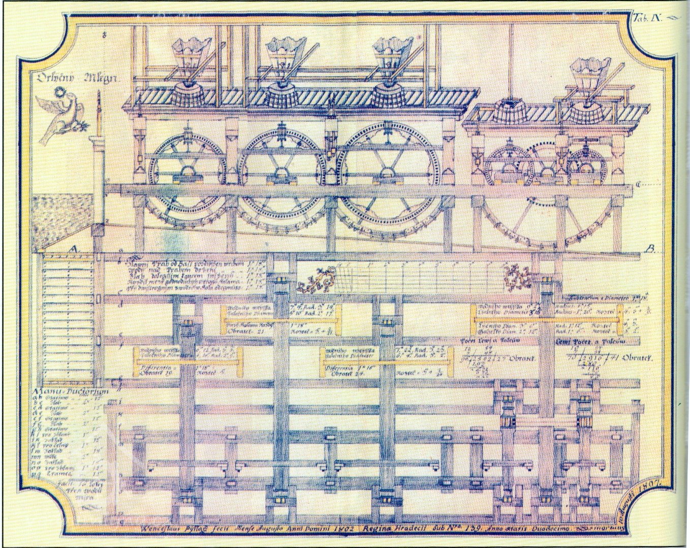 Schéma mlýna o 3 složeních s koly na spodní vodu, 1802, © J. a V. Pilařové (SOkA Hradec Králové)