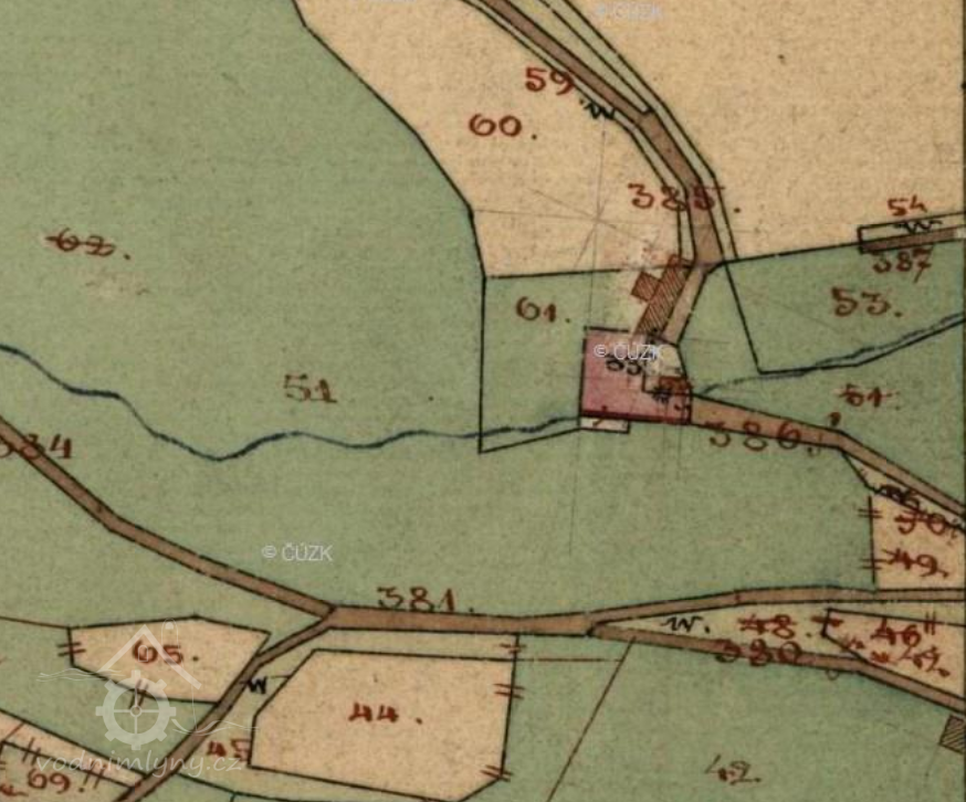 Popis1930: 2 kola na svrchní vodu, hltnost 0,065 m3/s, spád 7 m, výkon 4 HP