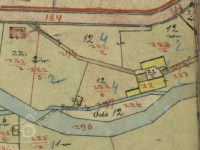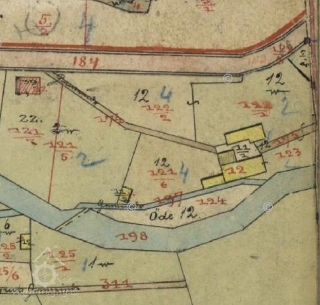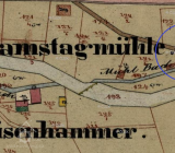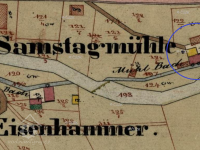 Objekt mlýna "Samstagmühle" /v listinách uváděného jako "Samstagmühle NC. 12 in Leimsgrub" /je zobrazen na mapě Stabilního katastru: Čechy: 7408-2 k.ú.Strážný /Kuschwarda/, mapový list č. 007. Stál v katastrálním území Hliniště /Leimsgrub/ a jednalo se o dva objekty. Prvním byl mlýn/dům čp. 12/st.p. 11/1. Druhým byl pak v r. 1928 postavený obytný dům čp. 29 /st.p.11/2. /západně od st.p.11/1./