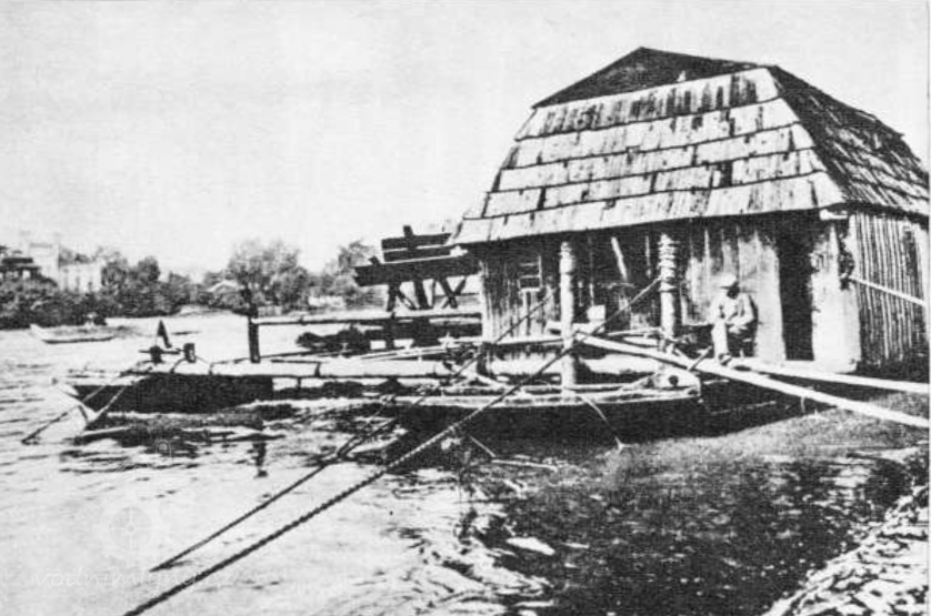 „Mlýn tohoto typu na Labi u Lovosic byl umístěn na dvou člunech. Na větším plochém stála roubená budova s mansardovou střechou, kde bylo mlecí zařízení. Osmilopatkové vodní kolo bylo druhým koncem své osy uloženo do čepového ložiska na malém člunu. Vodní kolo mezi oběma čluny bylo tokem vody otáčeno a obrátky se přenášely na mlýn, který sloužil především k mletí obilné mouky. Oba čluny byly spojeny trámy, na kterých byly i lávky. Plovoucí mlýn byl připoután vždy blíže ke břehu a malý člun byl na plném toku řeky. Můstek mezi břehem a mlýnem sloužil k přenášení zrní a mouky.