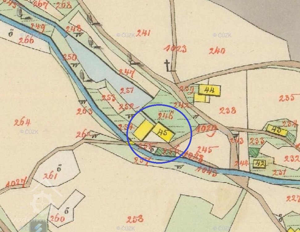 PopisV r. 1930 zde byla 2 kola na svrchní vodu, průtok 0,07 a 0,05 m3/s, spád 5 a 4,35 m, výkon 5,29 k.