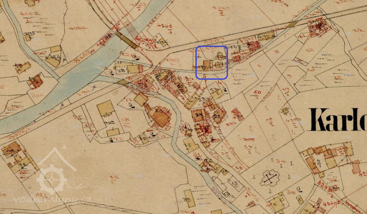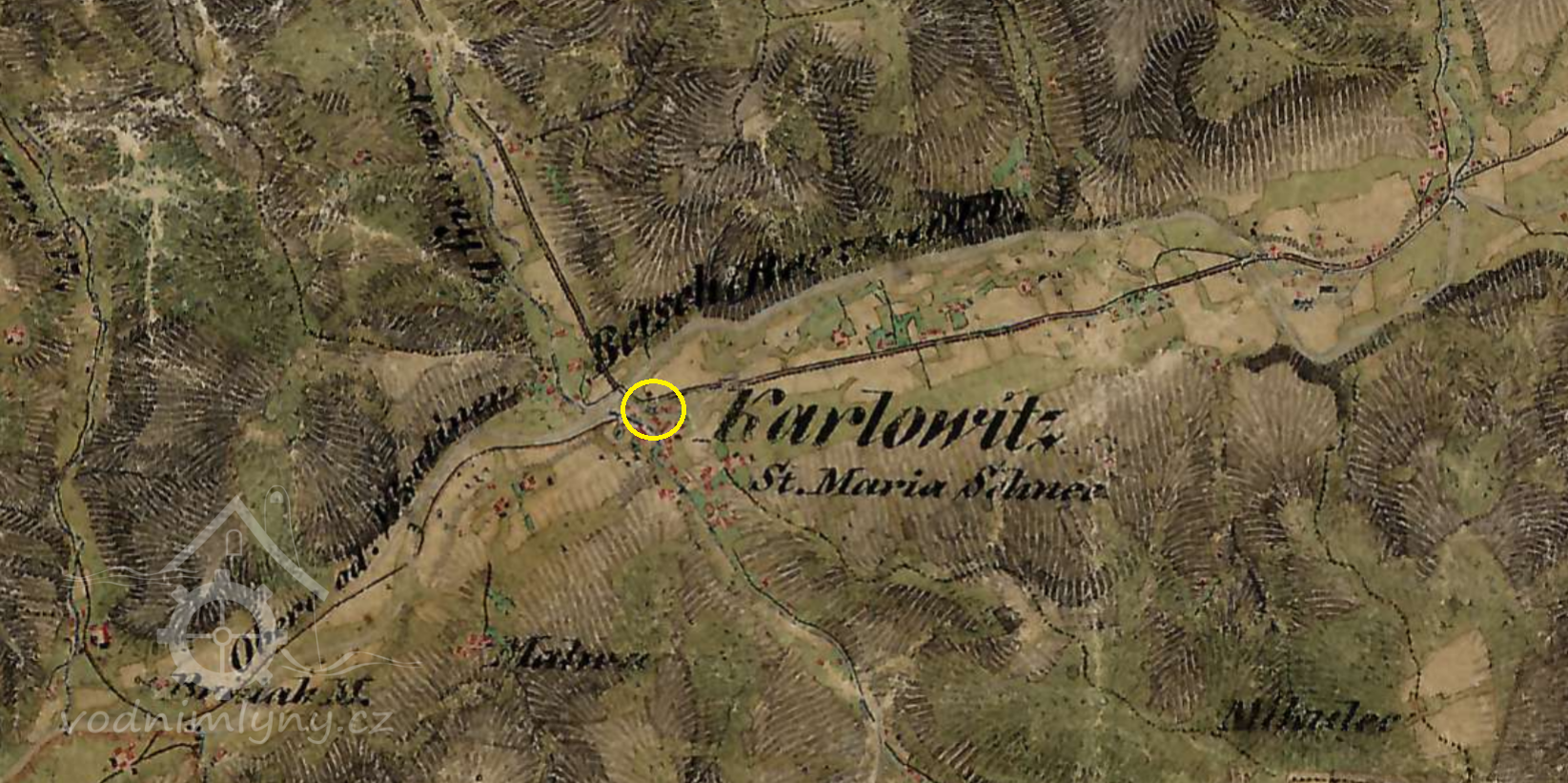 Mlýn byl postaven před rokem 1754 a byl prvním mlýnem v Karlovicích, později zvaný "dolní panský". Brzy k mlýnu přibyla i pila a valcha.