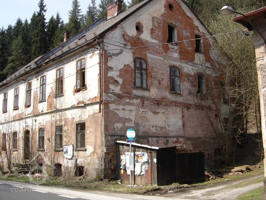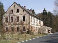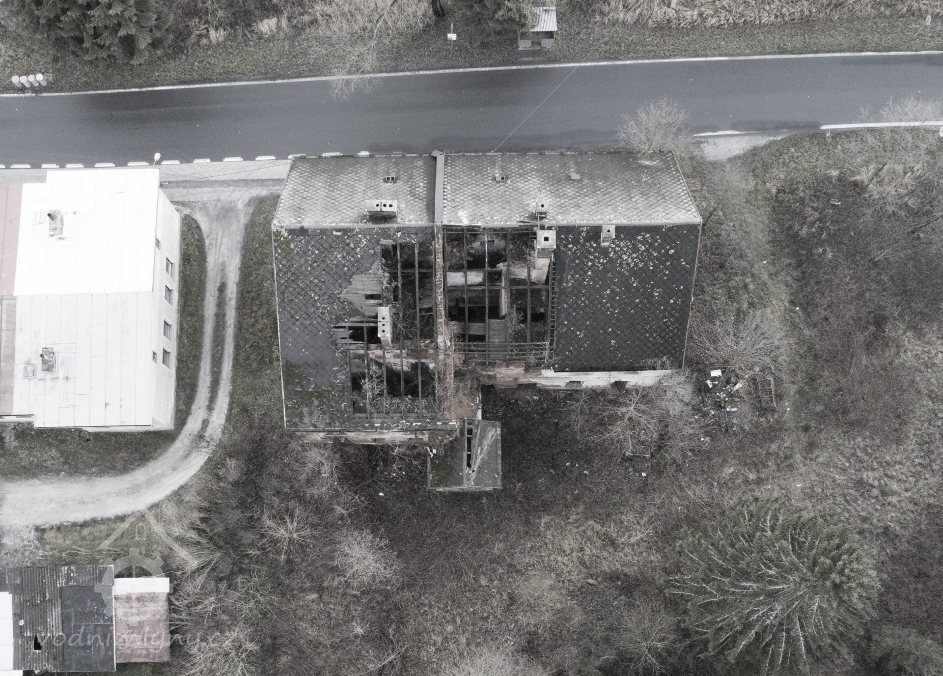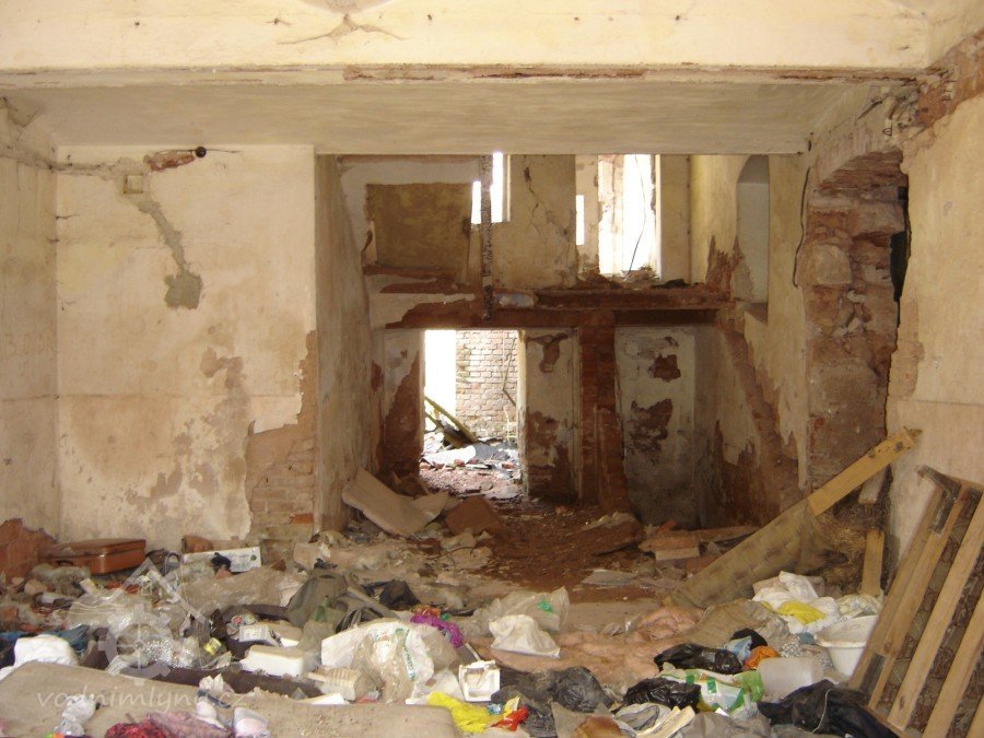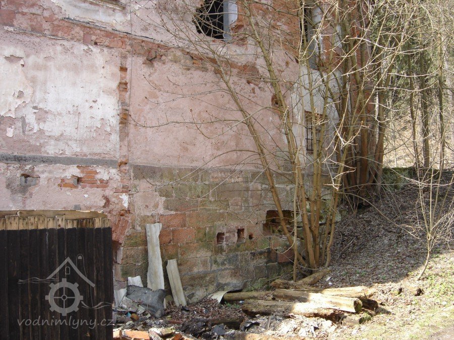Chátrající budova mlýna stojí při silnici z Debrného do Nových Zámků.