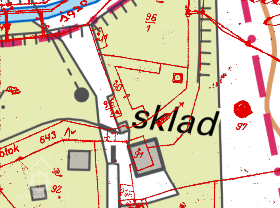 Původní jez měl délku 21 m a 4 stavidla, nad stavidly byla šindelem krytá stříška. Délka náhonu byla 217 m a náhon od mlýna zpět do Hané měl 160 m. Do zdiva u větší turbíny byl zabudován železný hřebík s mosaznou hlavičkou, označující nadmořskou výšku 202,65 m. Byl důležitý při kontrole průtoku a vodního práva vůbec. Hřebík nahradil původní hamový kůl, osazený v roce 1843 ve směru pod jezem mezi mlýnskou strouhou a Hanou. Stav vody byl rozhodující pro správný chod mlýnských kol nebo turbín, ale pokud byl mimořádně suchý rok, mohl se chod mlýna i zastavit, jak tomu bylo v roce 1908, kdy byl mimo provoz 2 měsíce.