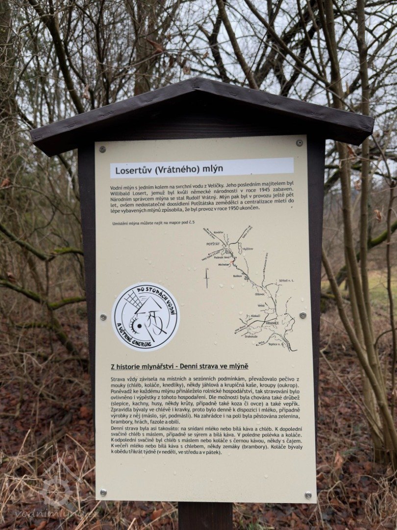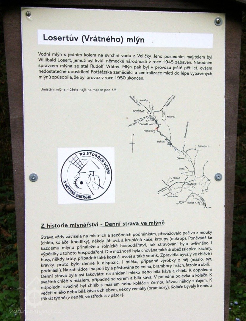 Jde o vodní mlýn s jedním kolem na svrchní vodu z Veličky. Jeho posledním majitelem byl W. Losert, jemuž byl kvůli německé národnosti v roce 1945 zabaven.