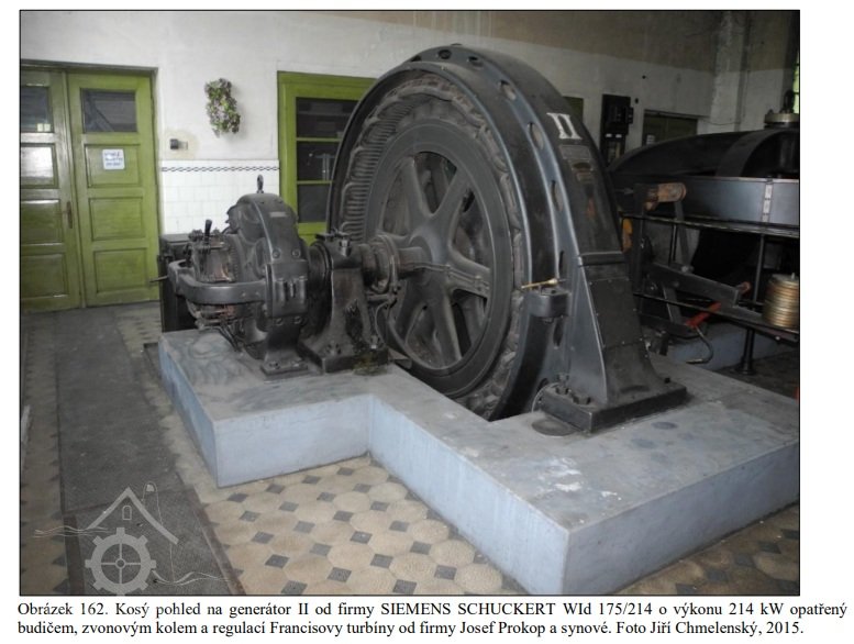 Popis1916 pro elektrárnu projektovány 2 Francisovy turbíny o hltnosti 9,5 m3/s, spád 1,9 m, výkon každé propočten na 185 HP