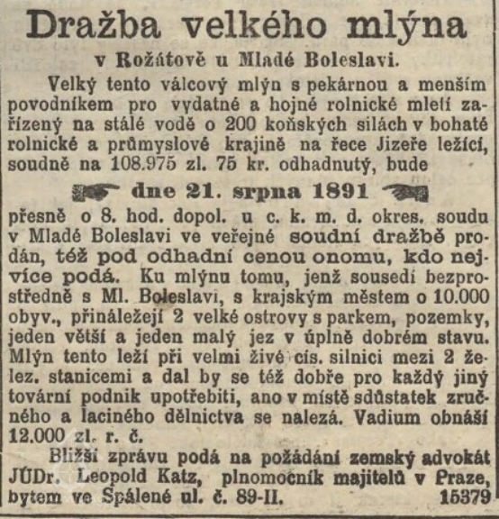1891 exekuční dražba mlýna. (RR) Koupil Josef Líman za 64.000 zl., namísto 5 kol instaloval jedno.