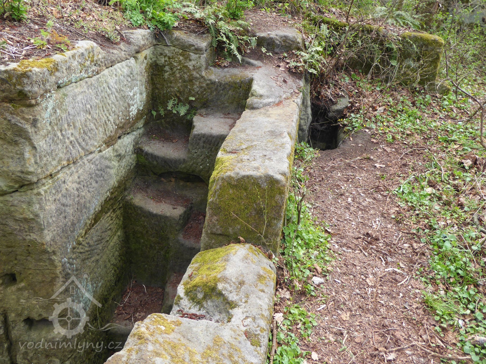 Námi sledovaný mlýn čp. 2 pod Dolanským rybníkem byl opatřen kolem na spodní vodu. Ještě v roce 1930 byl funkční, do současnosti se však dochovaly pouze části jeho staveb vysekané v pískovcovém podloží. Náhon mlýna byl do mlýnské lednice prosekán pískovcovým masivem, tvořícím hráz rybníka. Lednice byla také zcela zahloubena v pískovcovém podloží. Severní stěnou lednice byl proražen uzavíratelný vstup a otvor pro horizontální hřídel, která pokračovala do mlýnice. Ta byla horizontálně zahloubena do pískovcového podloží až do úrovně mlecí podlahy, stěny byly doplněny mohutnými pískovcovými kvádry. V mlýnici jsou jasně patrné stopy po zahloubení podkolí a po přisazení mlýnské hranice ke skalní stěně. Mlýnice byla schodištěm propojena s obytným čtyřprostorovým podlažím stavby, umístěným na úrovni terénu nad mlýnicí i lednicí. V těsném sousedství mlýna jsou v pískovcovém podloží zahloubeny dvě hospodářské prostory a jedna sezónně obytná. Ta je na vnitřním pilíři datovaná letopočtem 1813 a patrně sloužila k ubytování mlynářské chasy.
