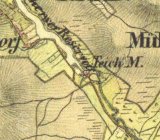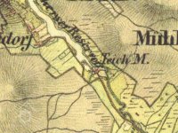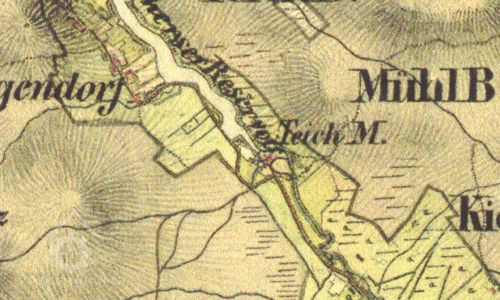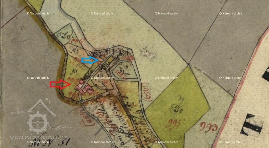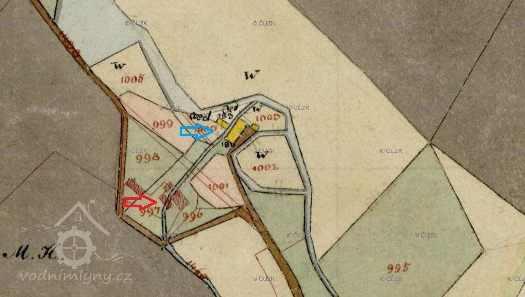 Původní mlýn stál na opačné straně cesty. Okolo r. 1826, jak vyplývá z provizorního nákresu na císařském otisku, zde byl postaven nový mlýn. Ten zanikl po r. 1945.