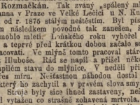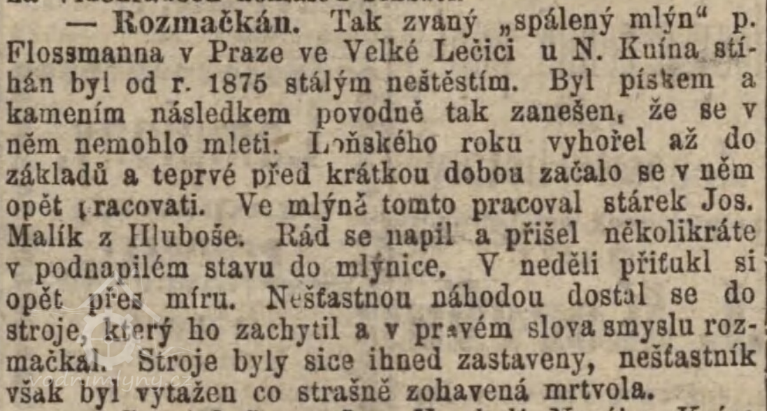 „Tak zvaný „spálený mlýn“ p. Flossmanna v Praze ve Velké Lečici, stíhán byl od r. 1876 stálým neštěstím. Byl pískem a kamením následkem povodně tak zanešen, že se v něm nemohlo mléti. Loňského roku vyhořel až do základů a teprve před krátkou dobou začalo se v něm opět pracovati. Ve mlýně tomto pracoval stárek Jos. Malík z Hluboše. Rád se napil a přišel několikráte v podnapilém stavu do mlýnice. V neděli přiťukl si opět přes míru. Nešťastnou náhodou dostal se do stroje, který ho zachytil a v pravém slova smyslu rozmačkal.“