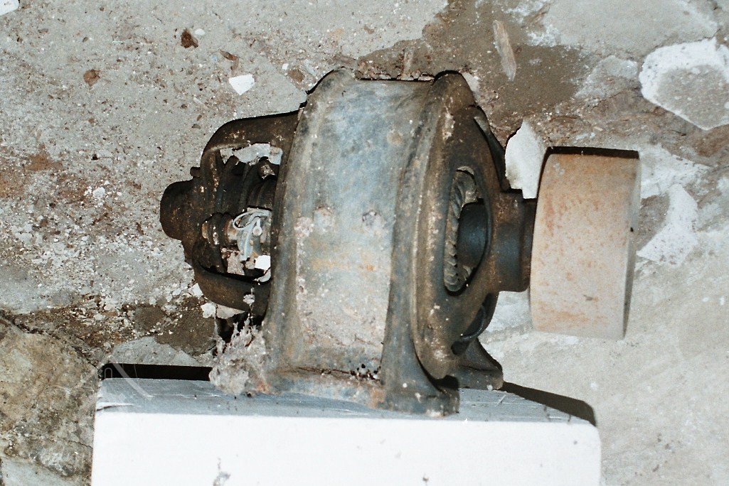transmise a předlohová hřídel s pastorkem a řemenicí od palečního převodu, 2009, © David Veverka, (Prvky na obrázku: transmise, řemenice, převody)