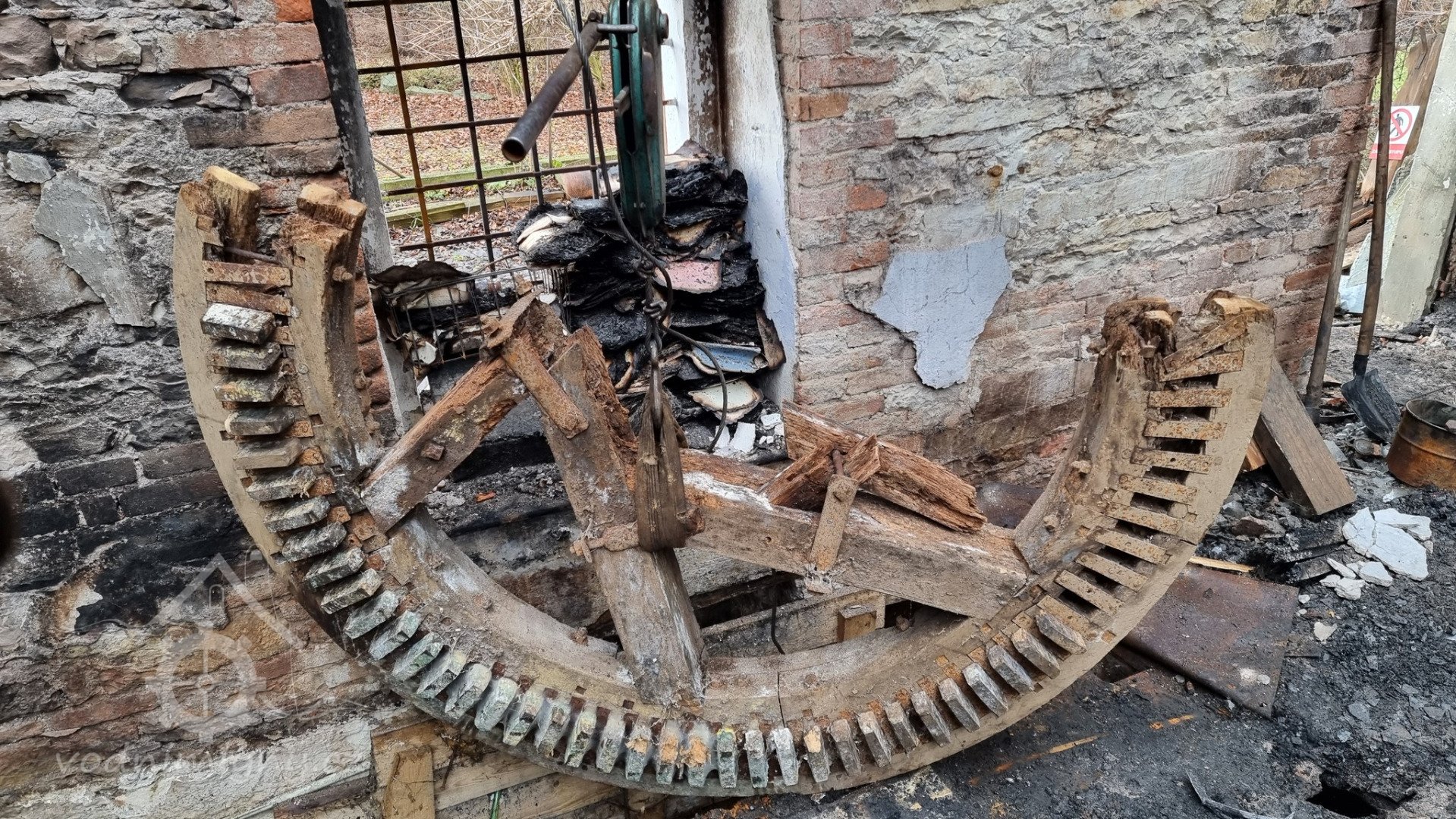 Podkolí po požáru, 01 2023, © Dušan Veverka, (Prvky na obrázku: transmise, řemenice, převody - paleční kola, pastorky a cévníky (řemeslný výrobek), transmise, řemenice, převody - transmisní hřídele s řemenicemi (výrobek průmyslový i řemeslný))