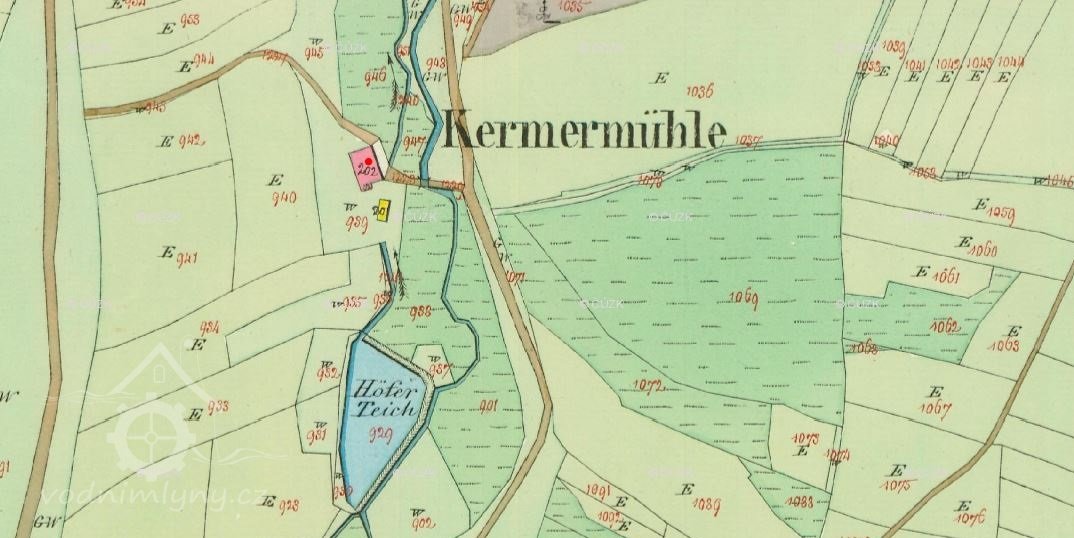 Správně Kermermühle, č. p. 178. V r. 1842 je psán majitel Philip Höfer, v r. 1930 byl majitel mlýna a pily František Sachs (RR).