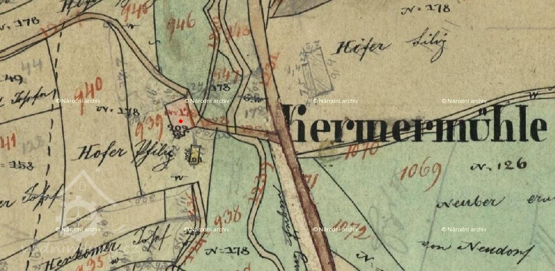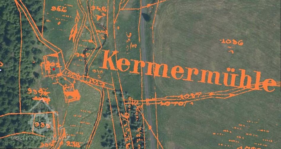 Kermer Mühle zanikl do roku 1953, kdy je z leteckého snímku patrné pouze obvodové zdivo mlýna.