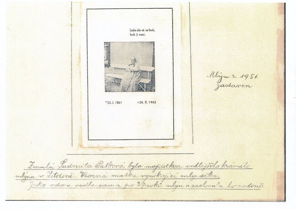 70. leta 20. stol. - ve mlýně žila péslední majitelka mlýna z rodiny Patků, která mlýn prodala firmě Potraviny Ústí nad Labem pro rekreaci zaměstnanců (HŠ)