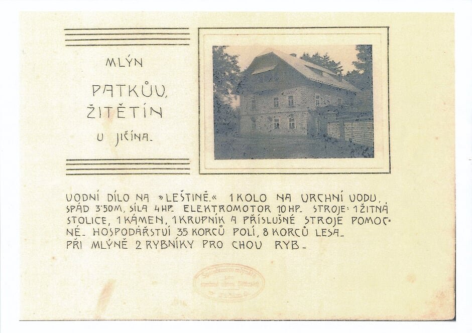 1922 - mlýn byl dostavěn za jeho syna JUDr. Jindřicha Patky. U mlýna byl vlastní rybník. (HŠ)